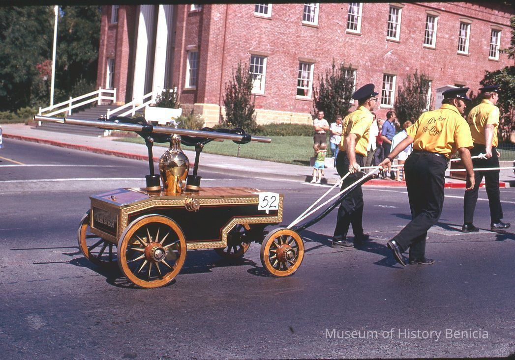 35mm Color Slide: shows entry from Arden in the 1972 Firemen's Muster Parade. Some of the crew are pulling a smaller sized wheeled pumper up first street.Collection
