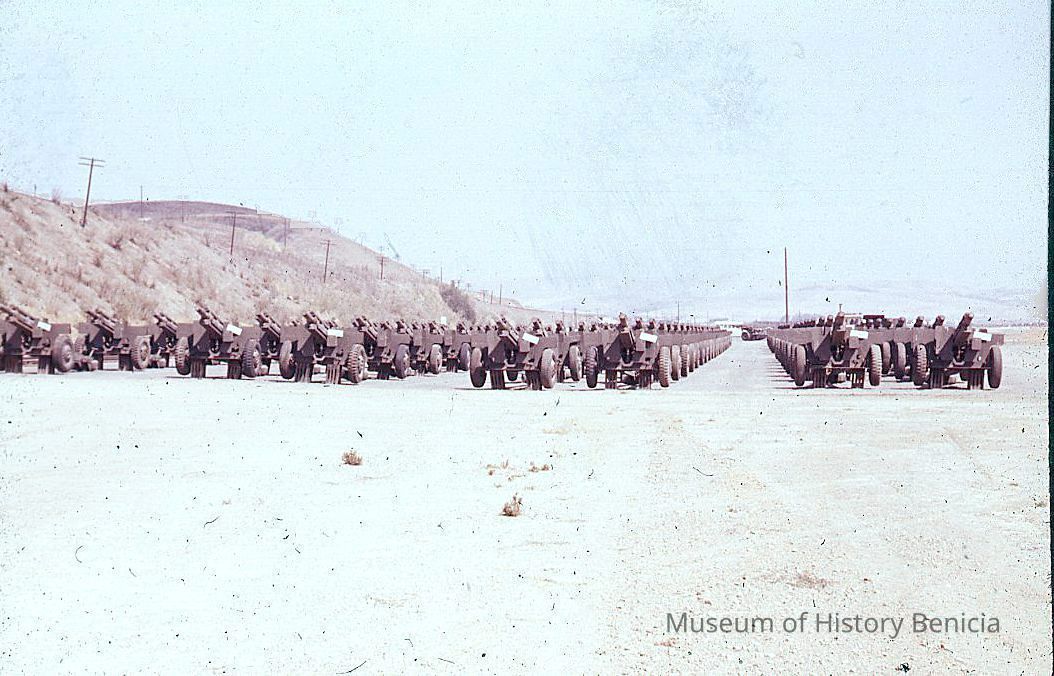 Slide taken by Mrs Cowell of guns in outdoor storage in Benicia Arsenal.