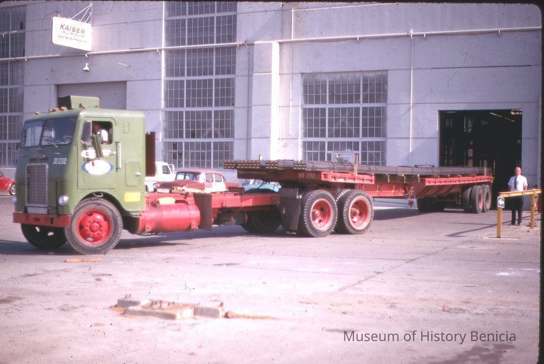 35mm Color Slide: shows large flat-bed truck taking material out of the Kaiser Aluminum warehouse
