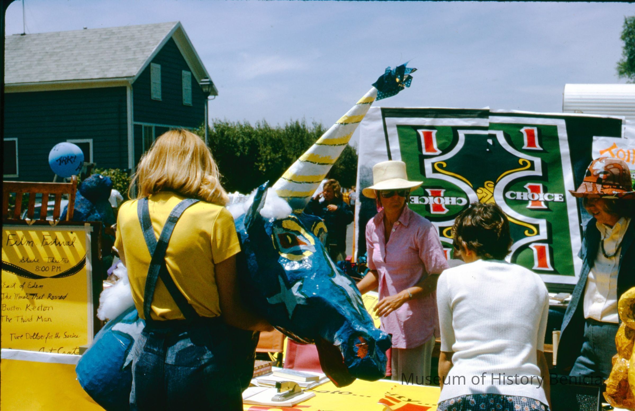 35mm Color Slide: Promotion for Art Center held on First Street Benicia: shows several people looking at informational materials on a table; one woman is holding what appears to be a papier mache unicorn headCollection