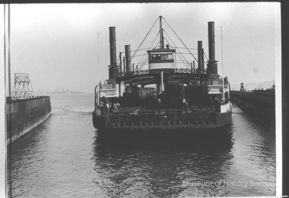 B/W 35mm Slide - SP train ferry "Solano" pulling in to dock at Benicia side of the system