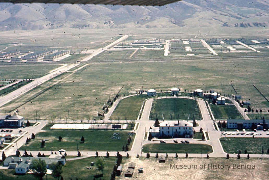 Slide taken by Mrs Cowell of aerial view of the admin area of the Benicia Arsenal.