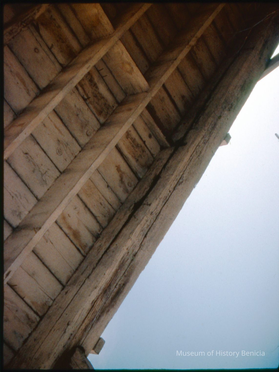 Ramp underside leading from upstairs Bldg. 9 to upstairs parking lot during modification to establish museum. 35 mm slide.