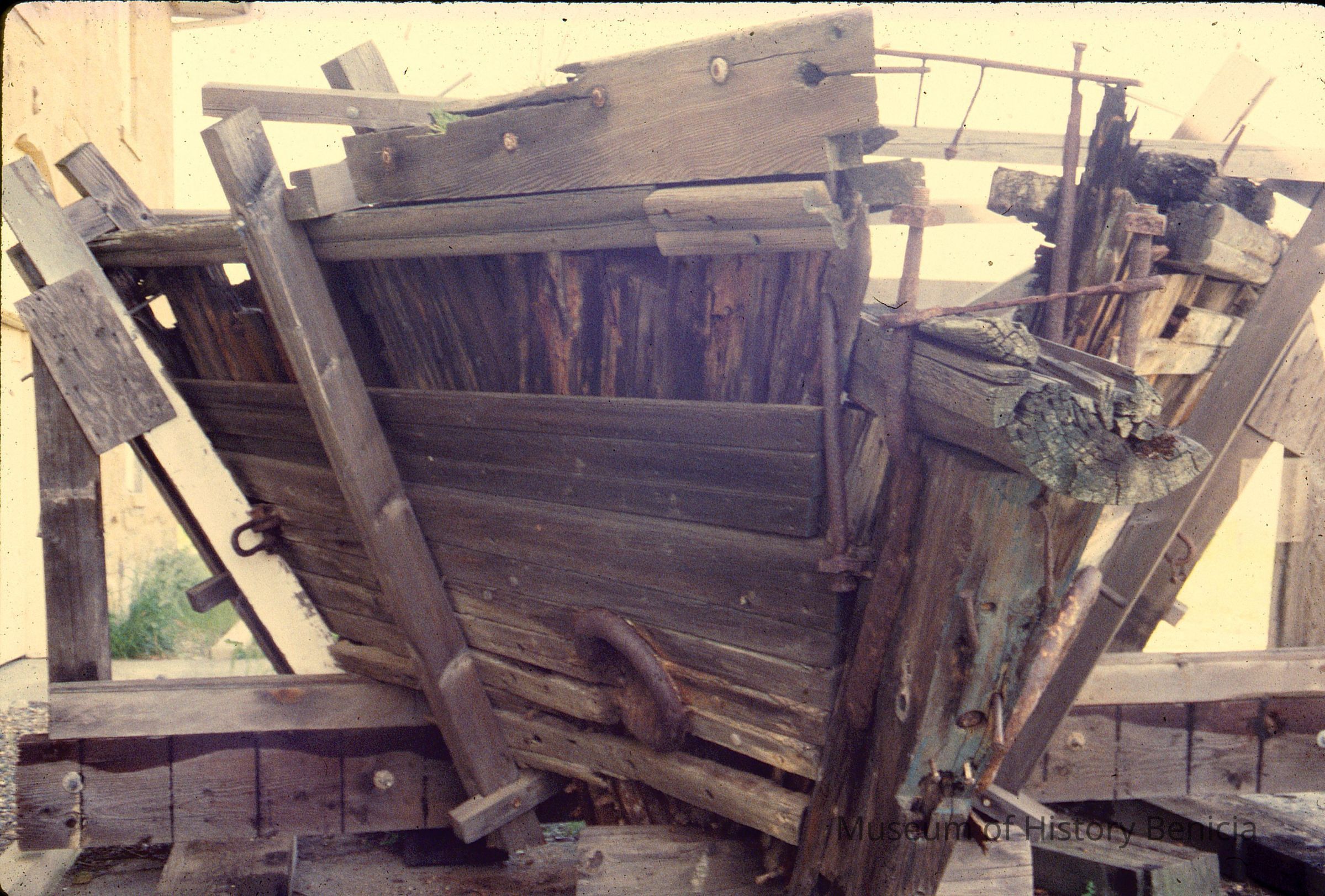 Remains of the bow of the ship Galilee at the Camel Barn Museum. Color slide.