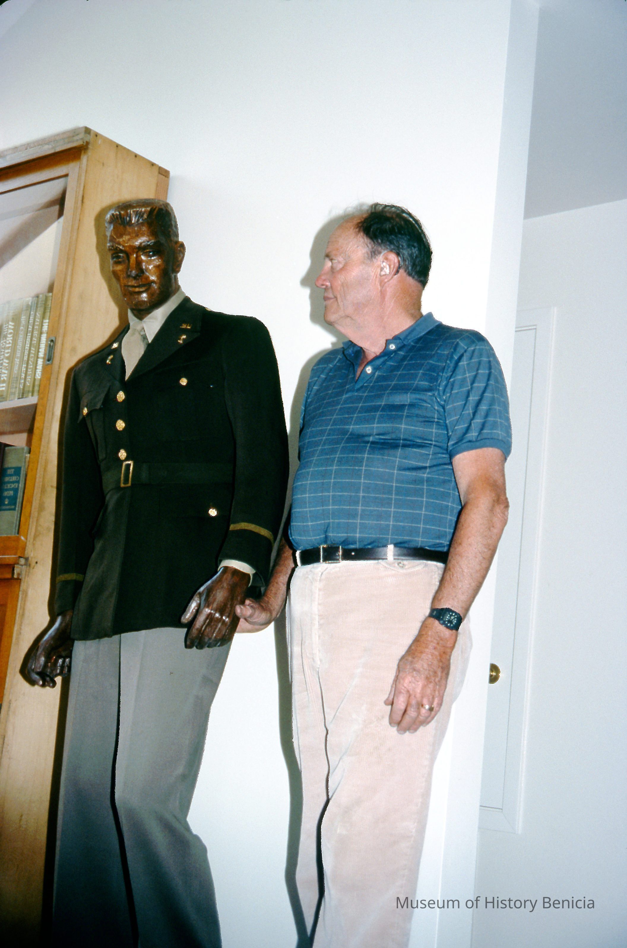 Color slide of Tom Hosley standing next to a mannequin wearing a uniform which belonged to Captain Dyer in WWII. Uniform is on a mannequin in the Powder Magazine 10.Collection