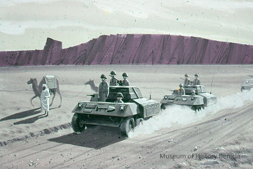 Slide of camels and armoured personnel carriers in the dessert. This is an illustration.