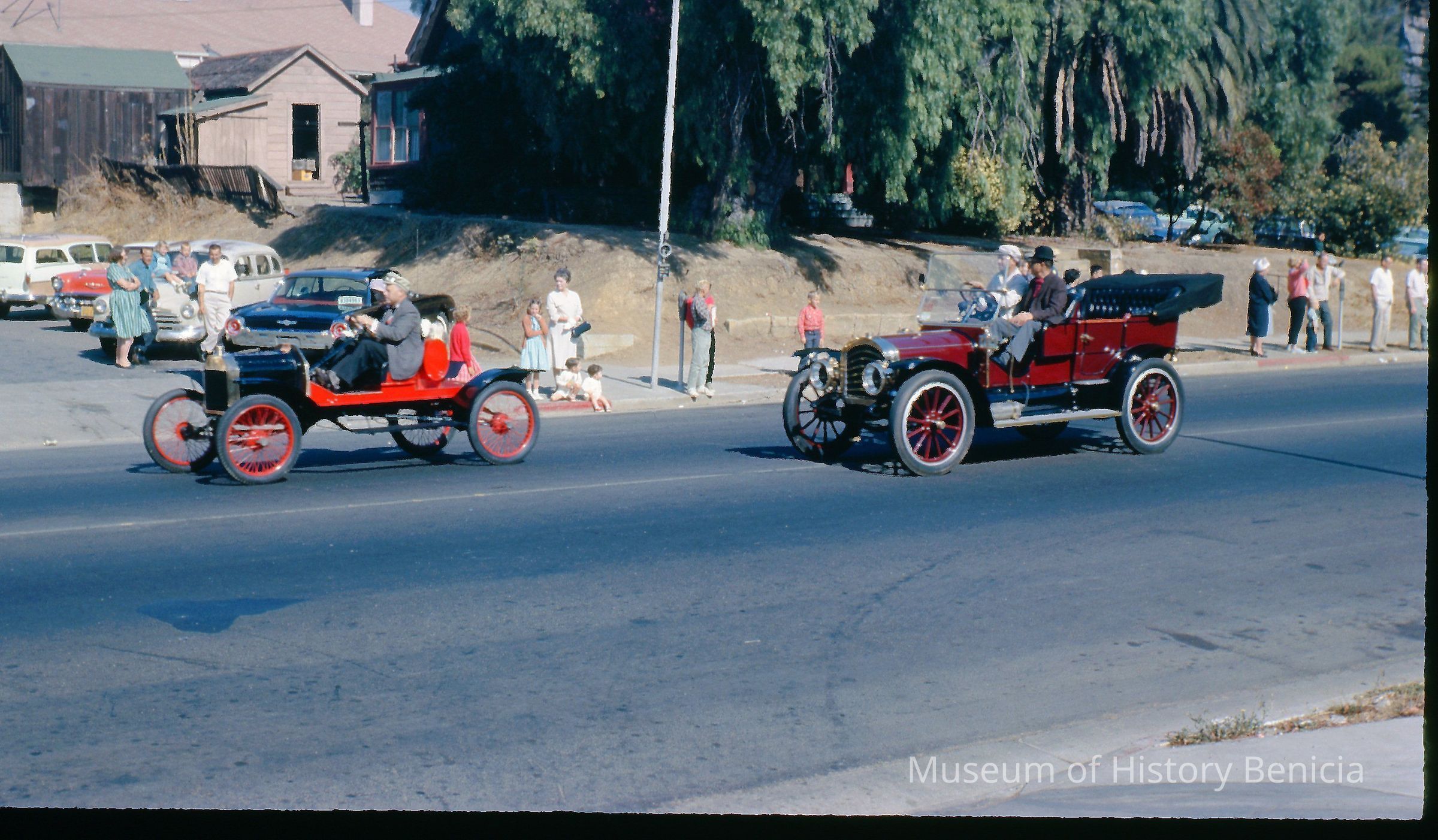 35mm Color Slide: Two old/antique cars in parade for dedication of Benicia-Martinez Highway Bridge, 9-15-62.