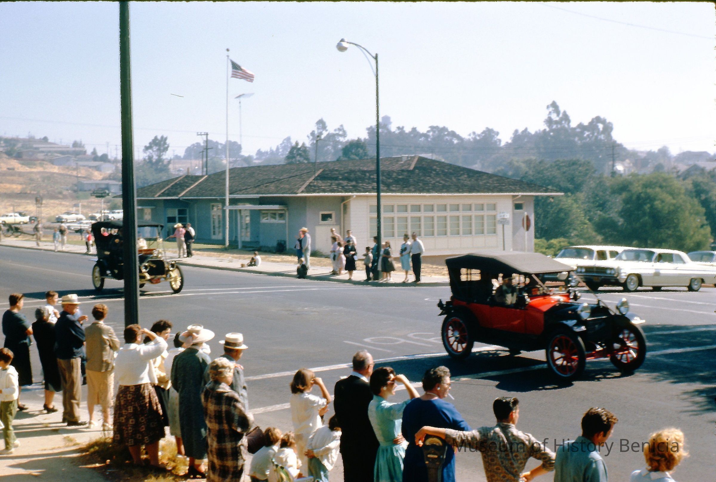 35mm Color Slide: Two more old/antique cars in parade for dedication of Benicia-Martinez Highway Bridge, 9-15-62. Veteren's Building is in the background; intersection of First Street and K StreetCollection