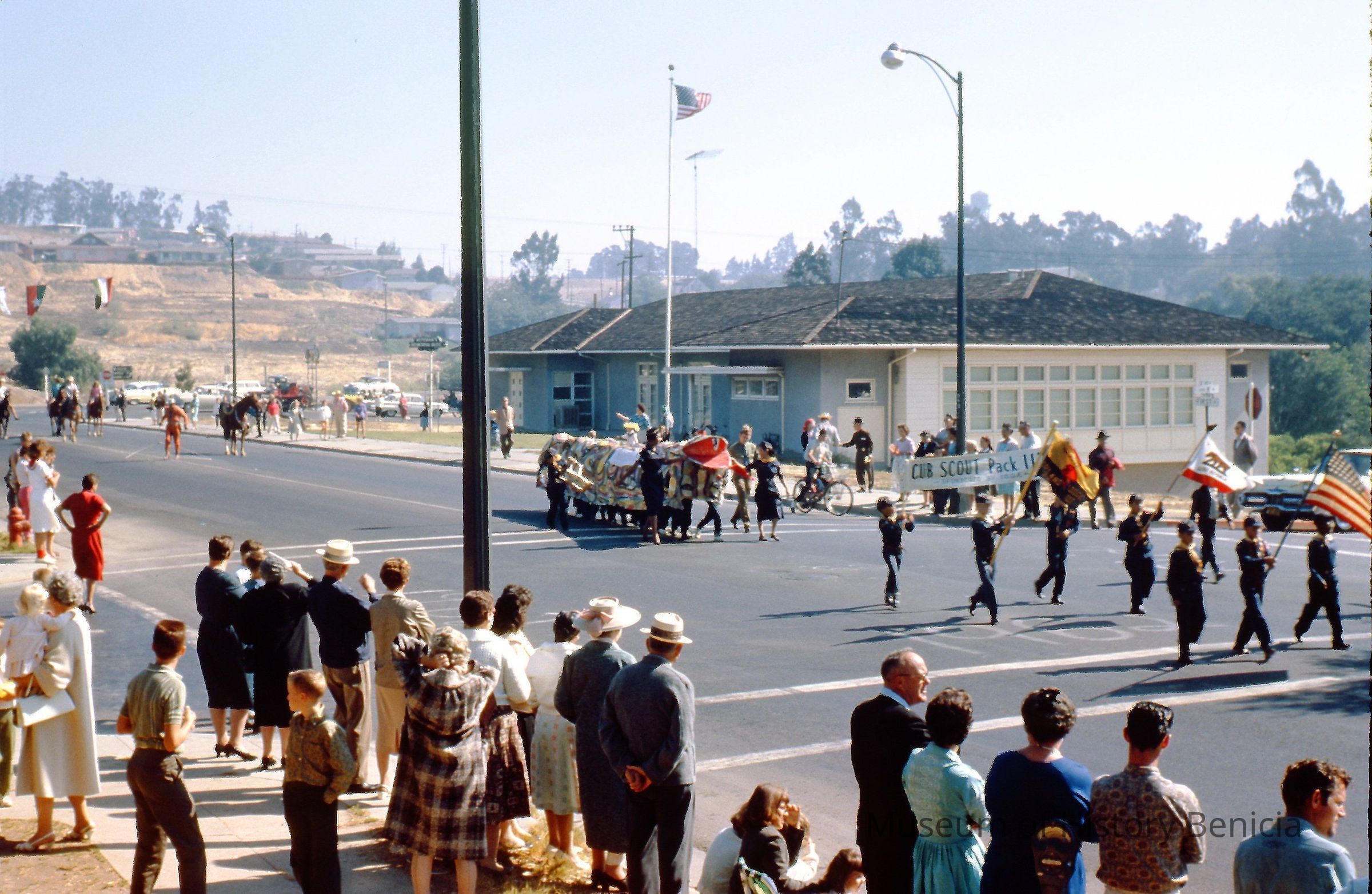 At intersection of First Street and K Street. Cub Scout pack marching, some sort of "dragon costume" being carried by a number of young people; horseback riders follow; the Veteran's Buildng is in the background