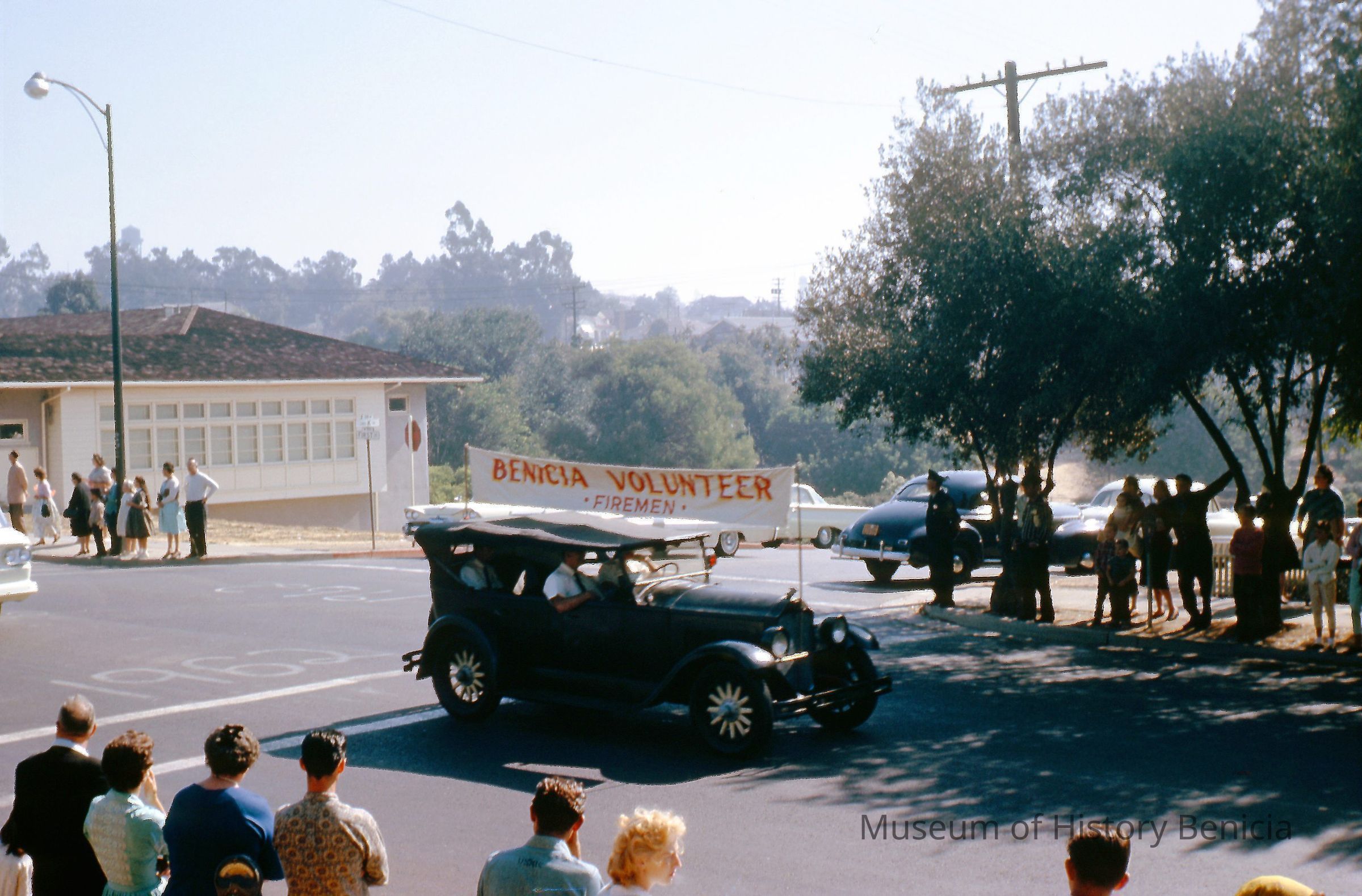 35mm Color Slide: Old/antique car with "Benicia Volunteer Firemen" banner in parade for dedication of Benicia-Martinez Bridge, 9-15-62.Collection