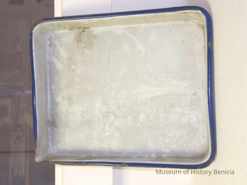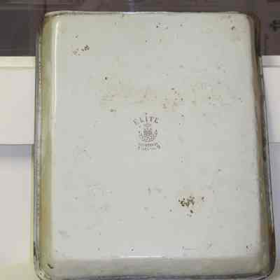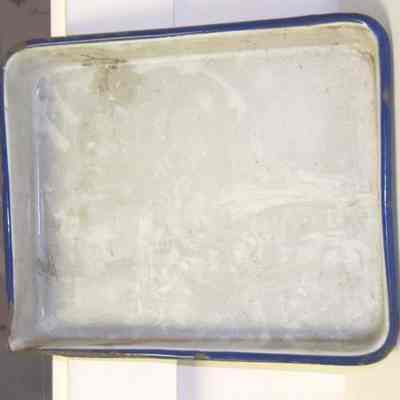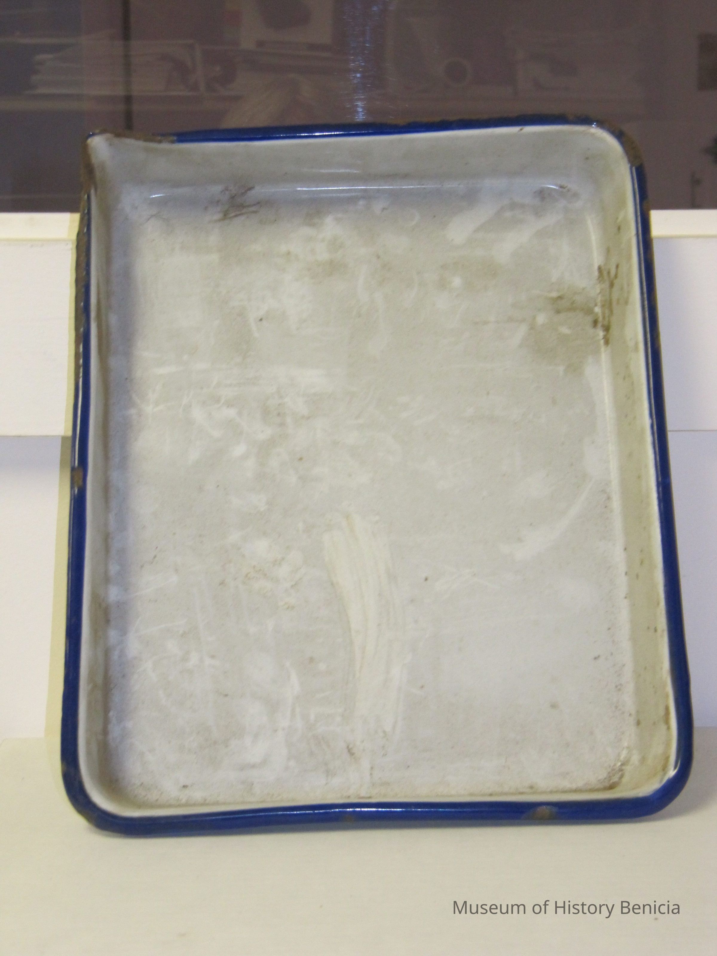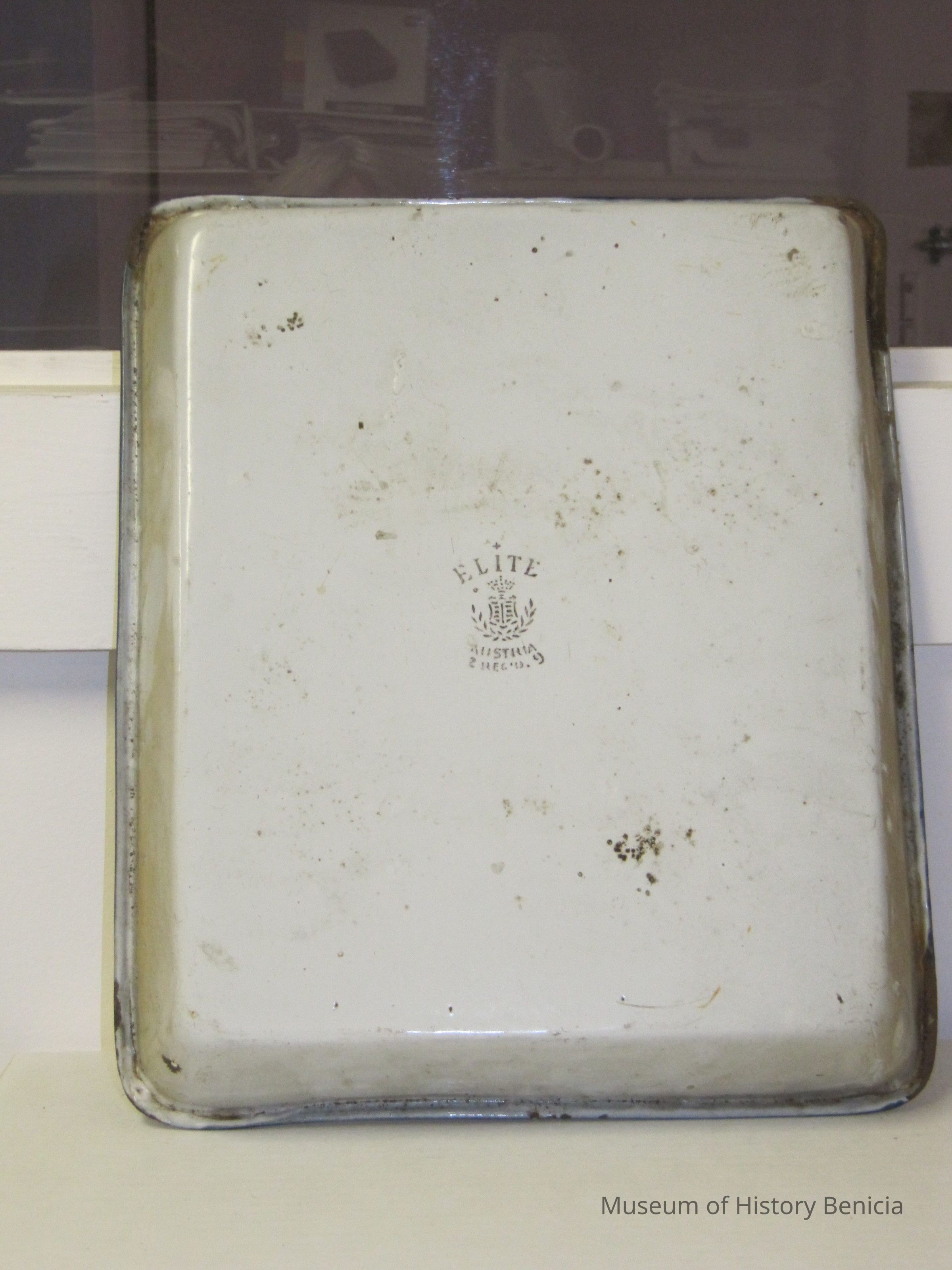 Developing tray. Metal, white with blue trim size 8 x 10. Stamped Austria on the bottom and "Elite"