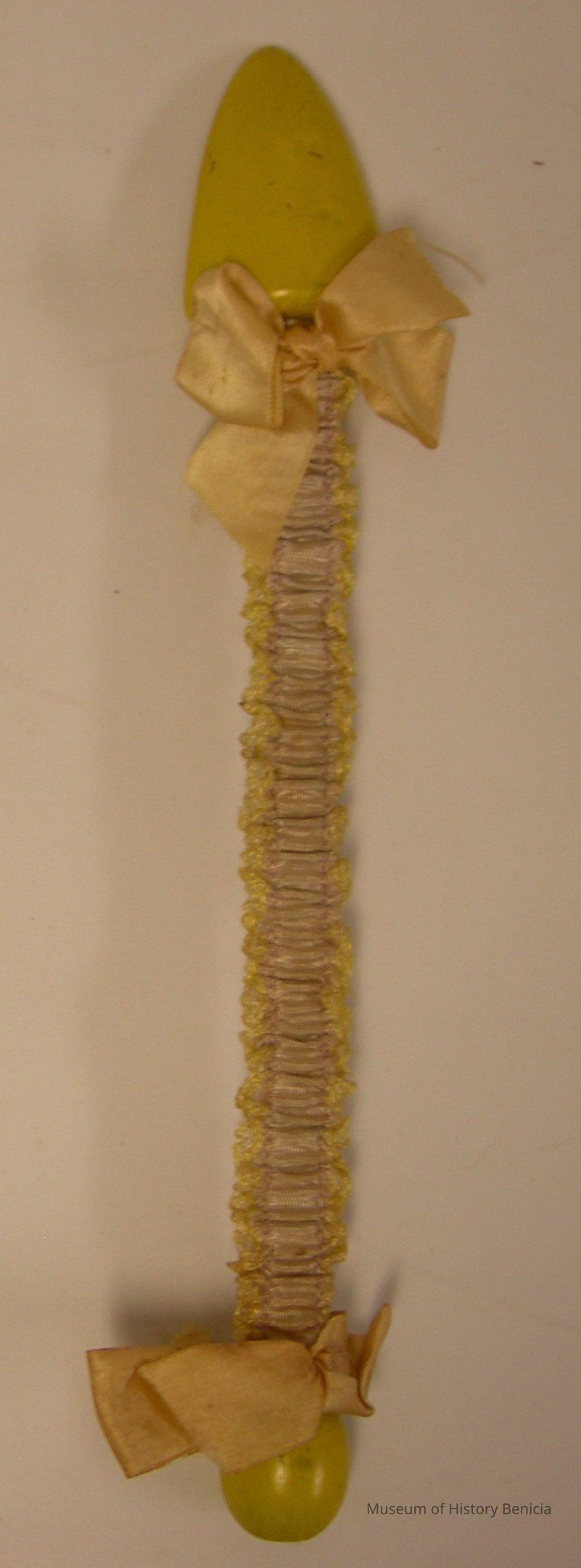 Shoe Tree, bendable metal and wood; metal is covered with pink/yellow cloth; there is a yellow, wooden triangle on one end and a rounded, yellow, wooden bead on the other; there is a pink ribbon bow at each wooden piece; 11-1/4" longCollection