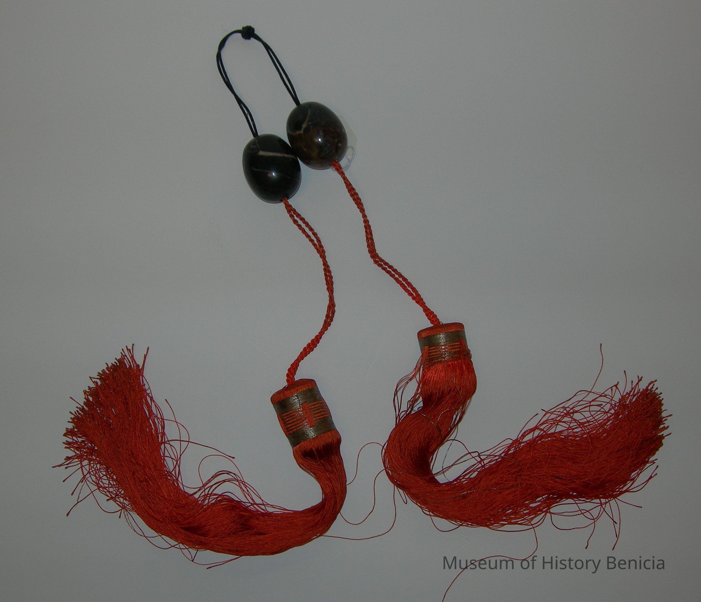 pair of Oriental decorative tassels topped with an agate stone; tassels are orange in color and the stones are various shades of gray and brown