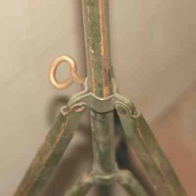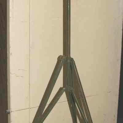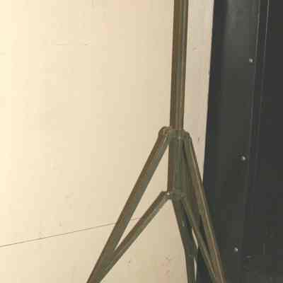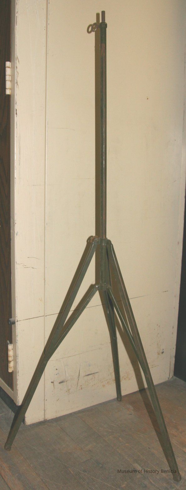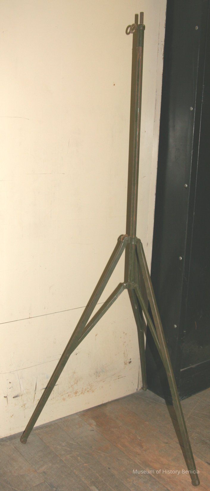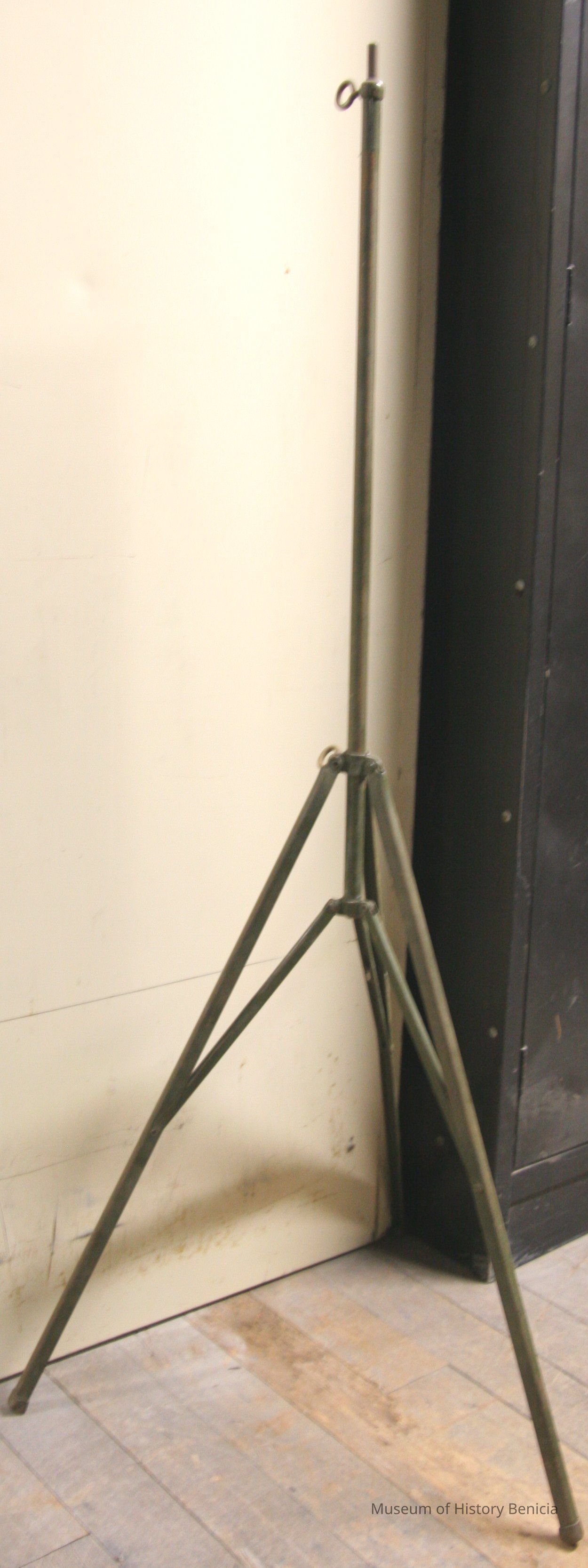 Three legged adjustable tripod assume it is to hold cameras. Army green color. Has fold out legs but does not have a head for holding camera. It is just a piece of metal with wing-nut adjustments.Collection