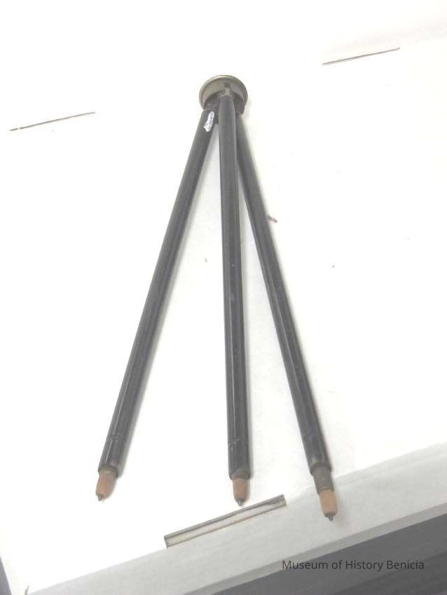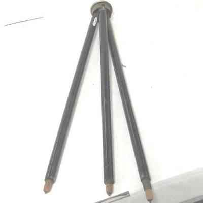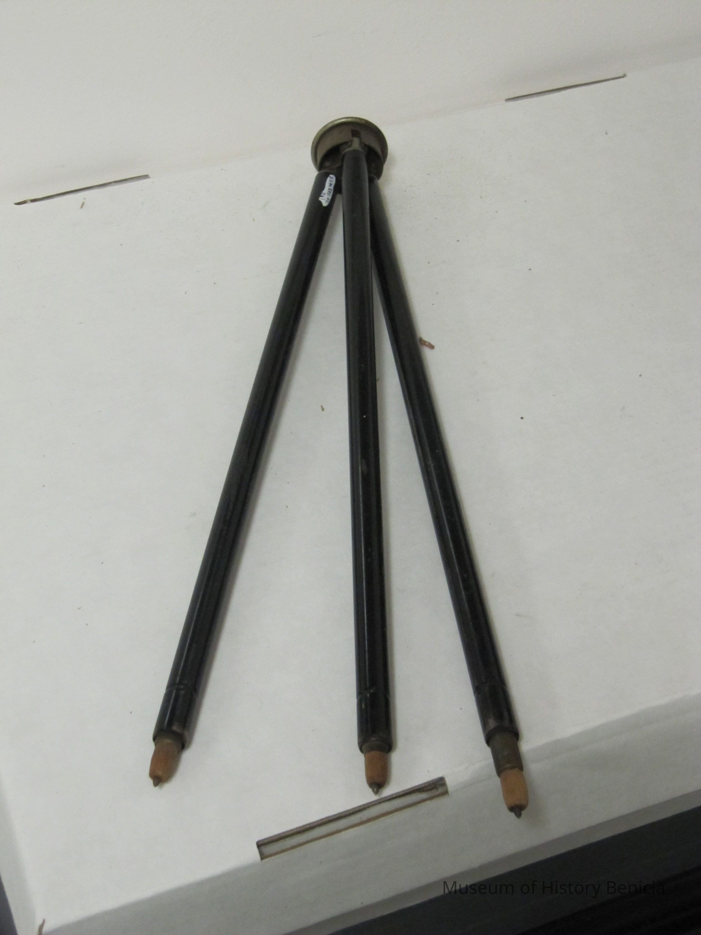 Black, metal tripod with brass camera mount and wooden feet. About 16" tall when collapsed and 3 feet tall expanded.