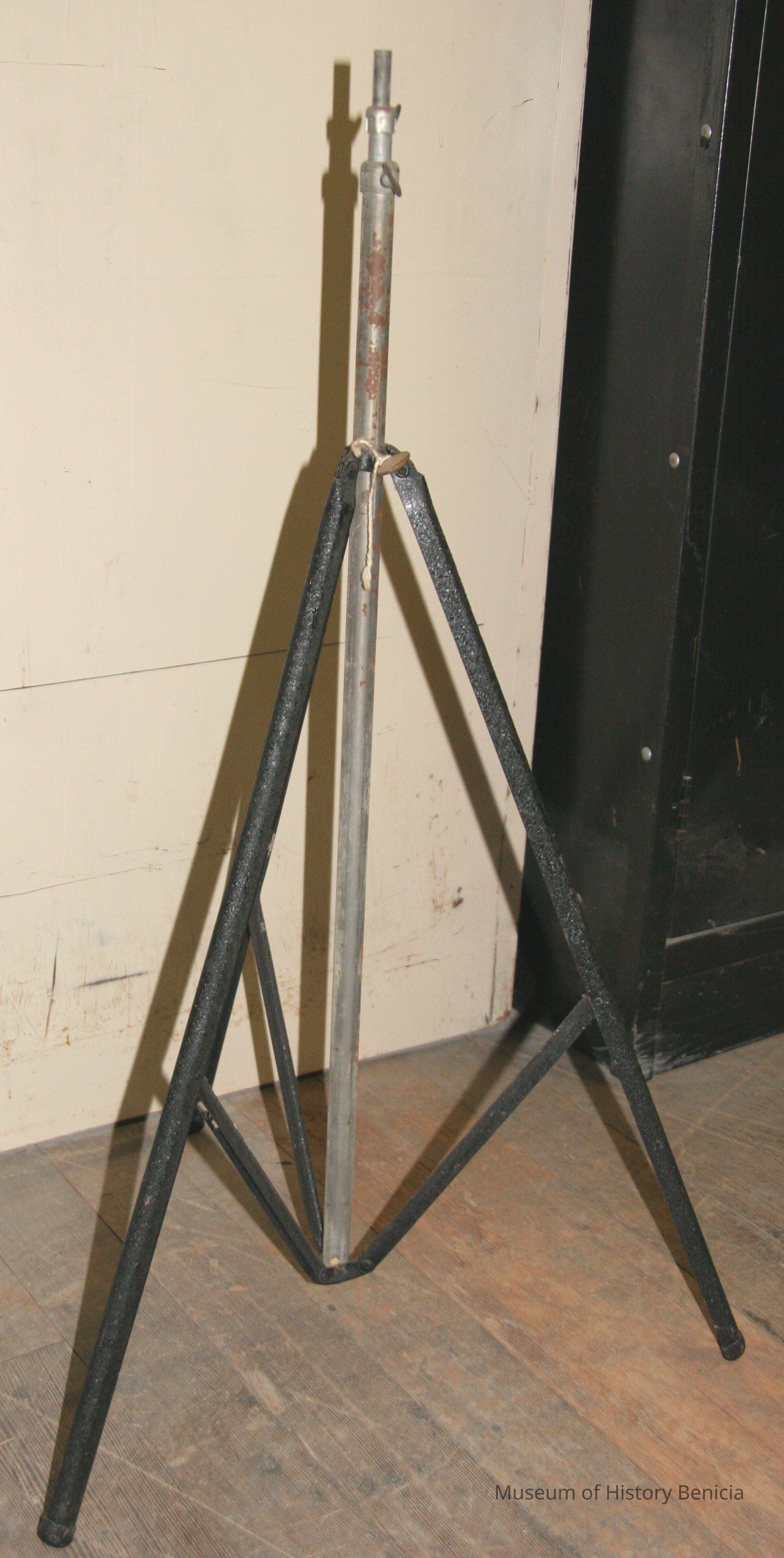 Three legged adjustable tripod assume it is to hold cameras. Has fold out legs but does not have a head for holding camera. It is just a piece of metal with wing-nut adjustments.Collection