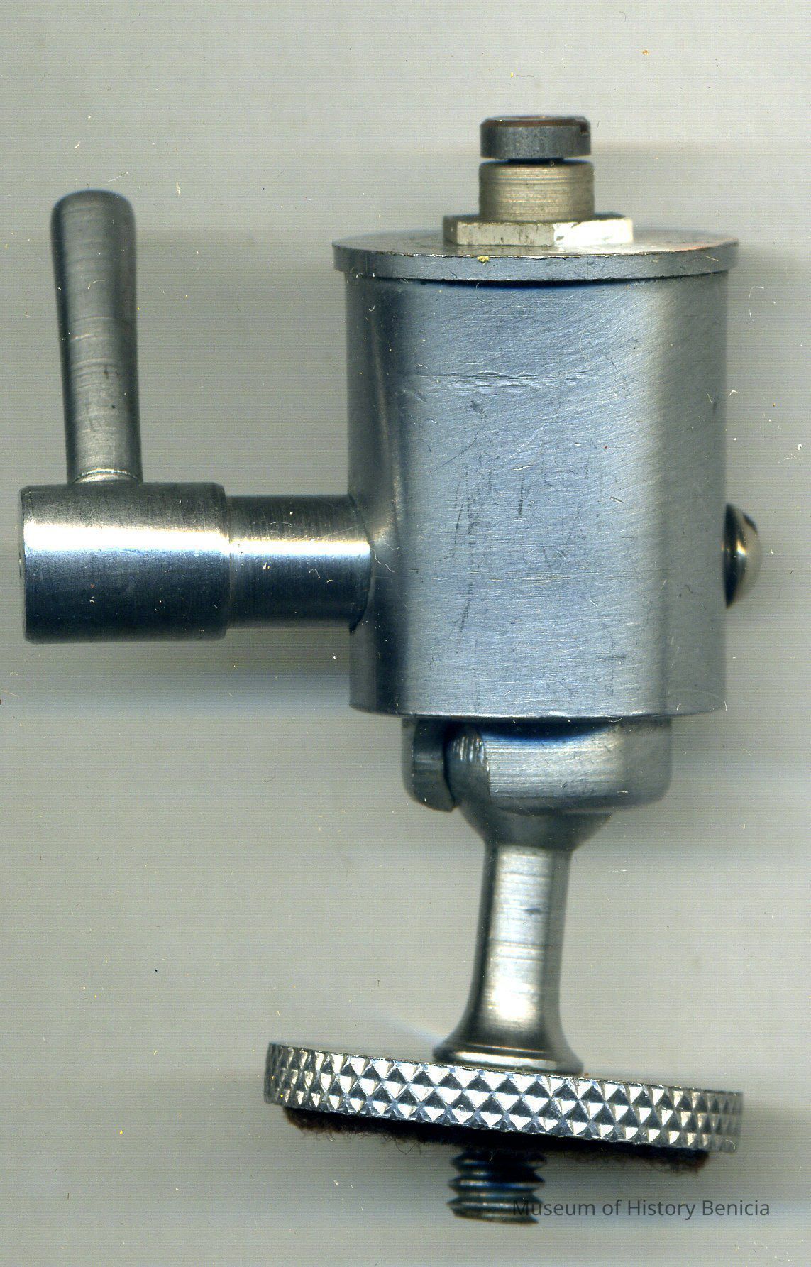 looks like the head of a tripod for connecting the camera to the tripod. It is 2.75" tall and 1.25" across where it connects to the camera. The name on it is Tiltrite.Collection
