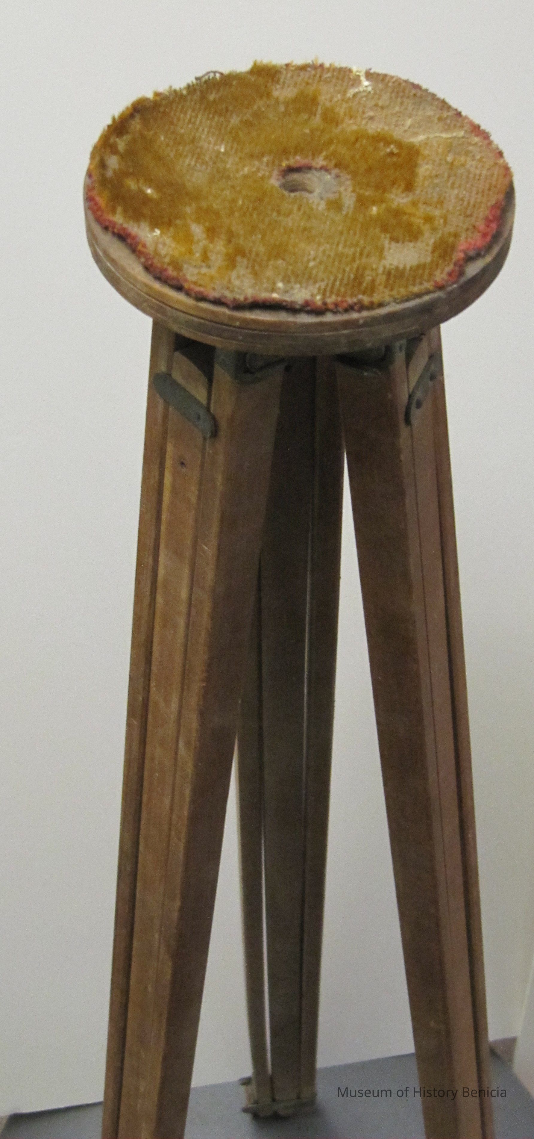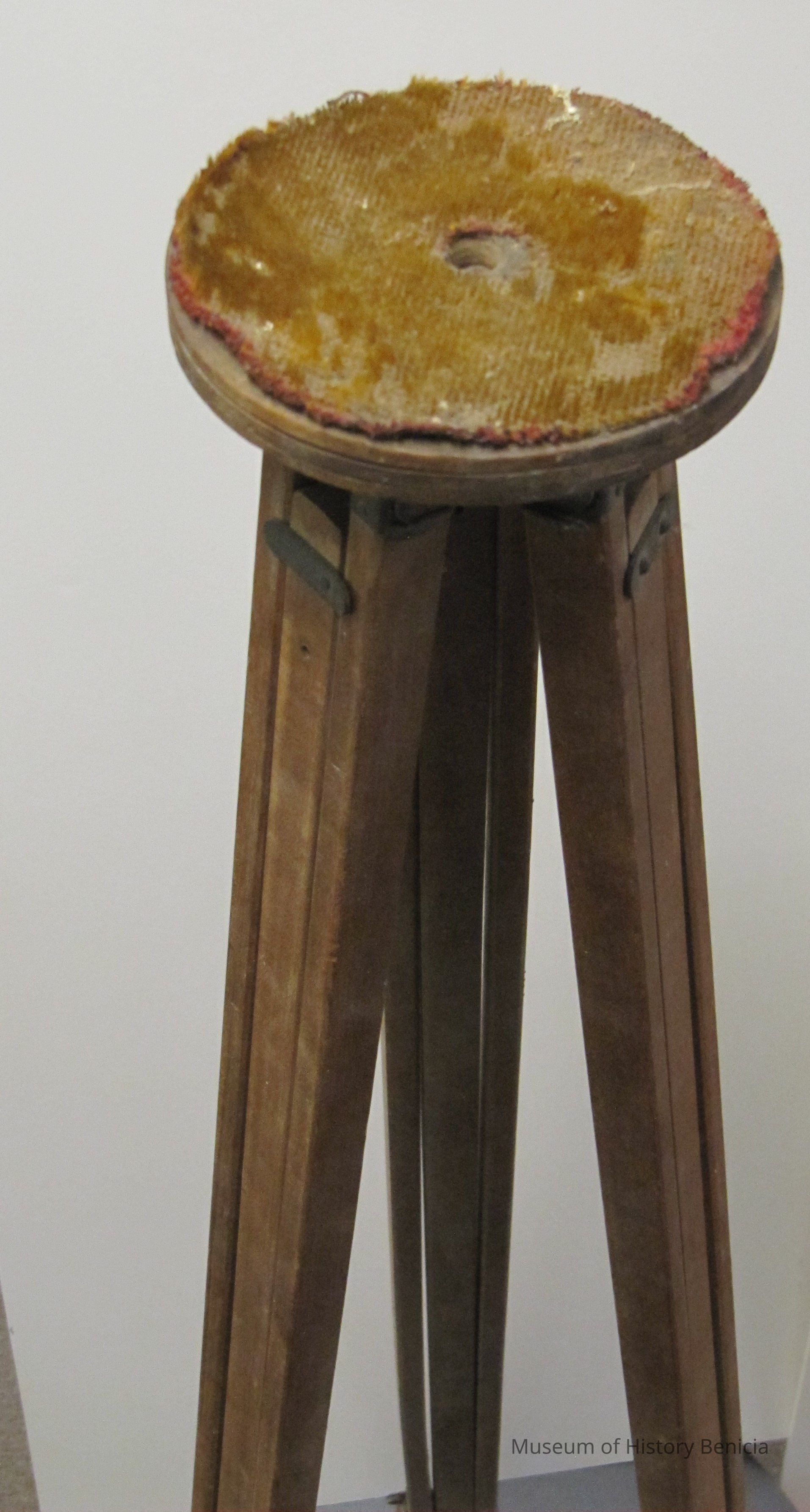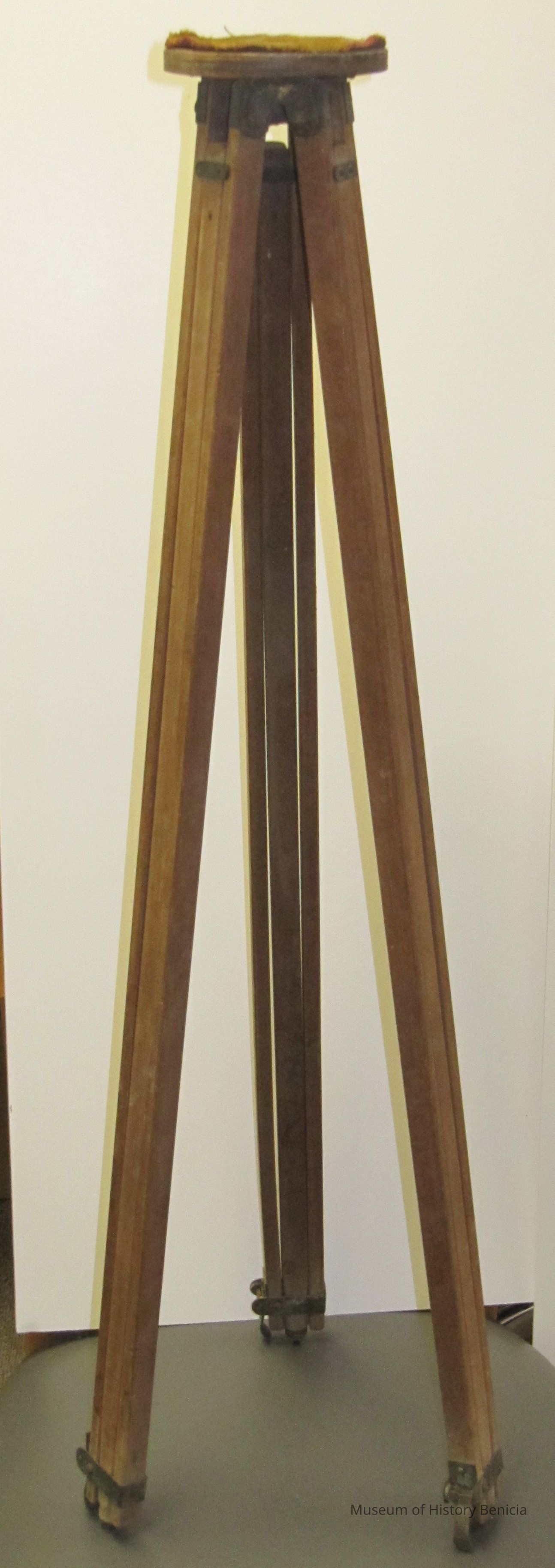 30 inch tall wooden tripod. This was probably used for photography. It has a 4 inch diameter round head with a screw in the middle for attaching to a camera. There is no maker's mark on the tripod. The legs are wooden with metal bracketts that hold the leg extensions in place. The tripod extends to abot 56 inches.Collection