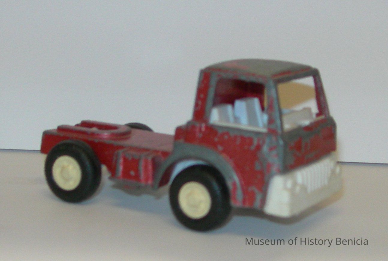 cast metal truck painted red, w/white plastic grill, seats and underside. 4 plastic wheels. " c 1970/Tootsie Toy r /Chicago, USA/Pat. Pend." molded into underside