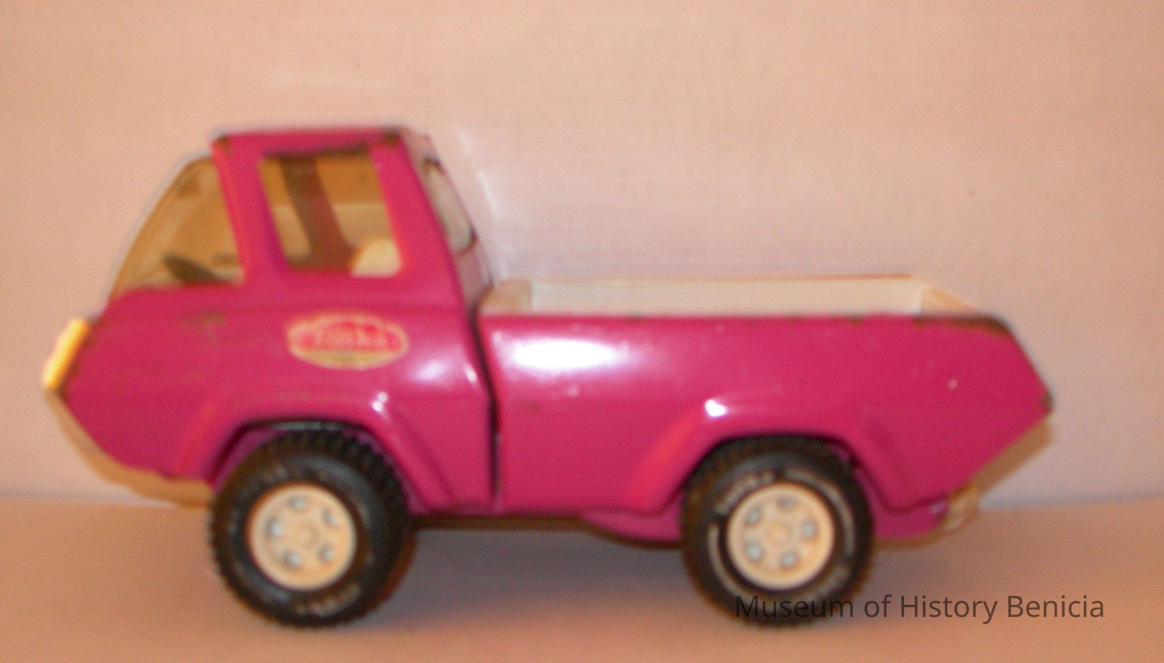 Tonka pick-up truck, pink body with white bed, four plastic wheels, white cab interior, silver plastic grill [a piece of string is tied to the tow connector]