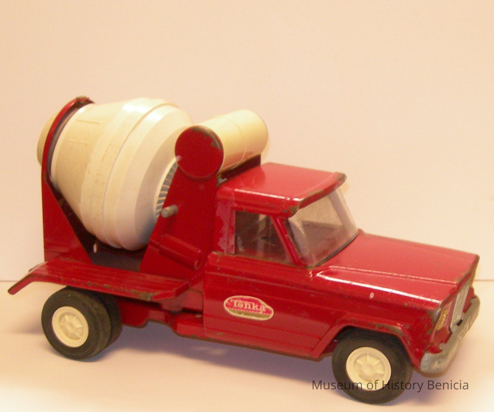 Tonka cement truck, red with white cement tumbler, six plastic tires, white wheel covers, decals both sides front, plastic cab windows, silver faux metal grill