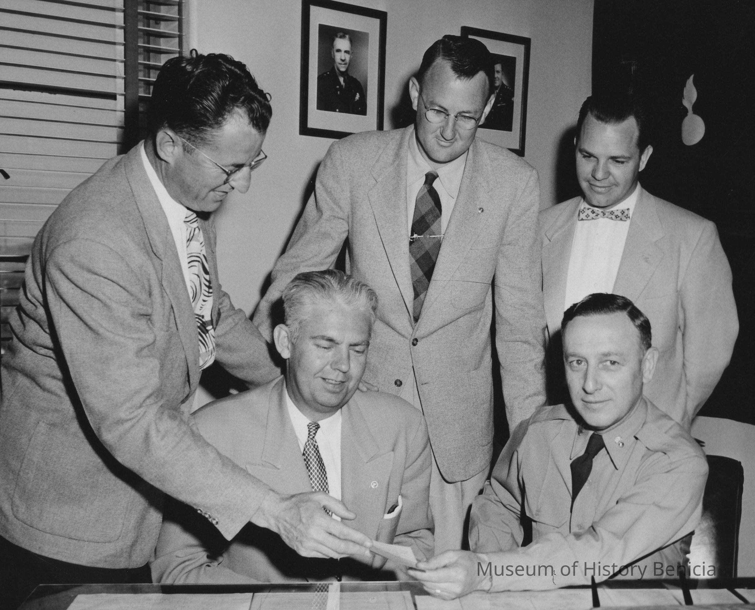 B/W Photograph: Five men clustered around a paper. From left: Edward Koenig, Walter Kamb, Michael Fitzgerald two on right unidentified.