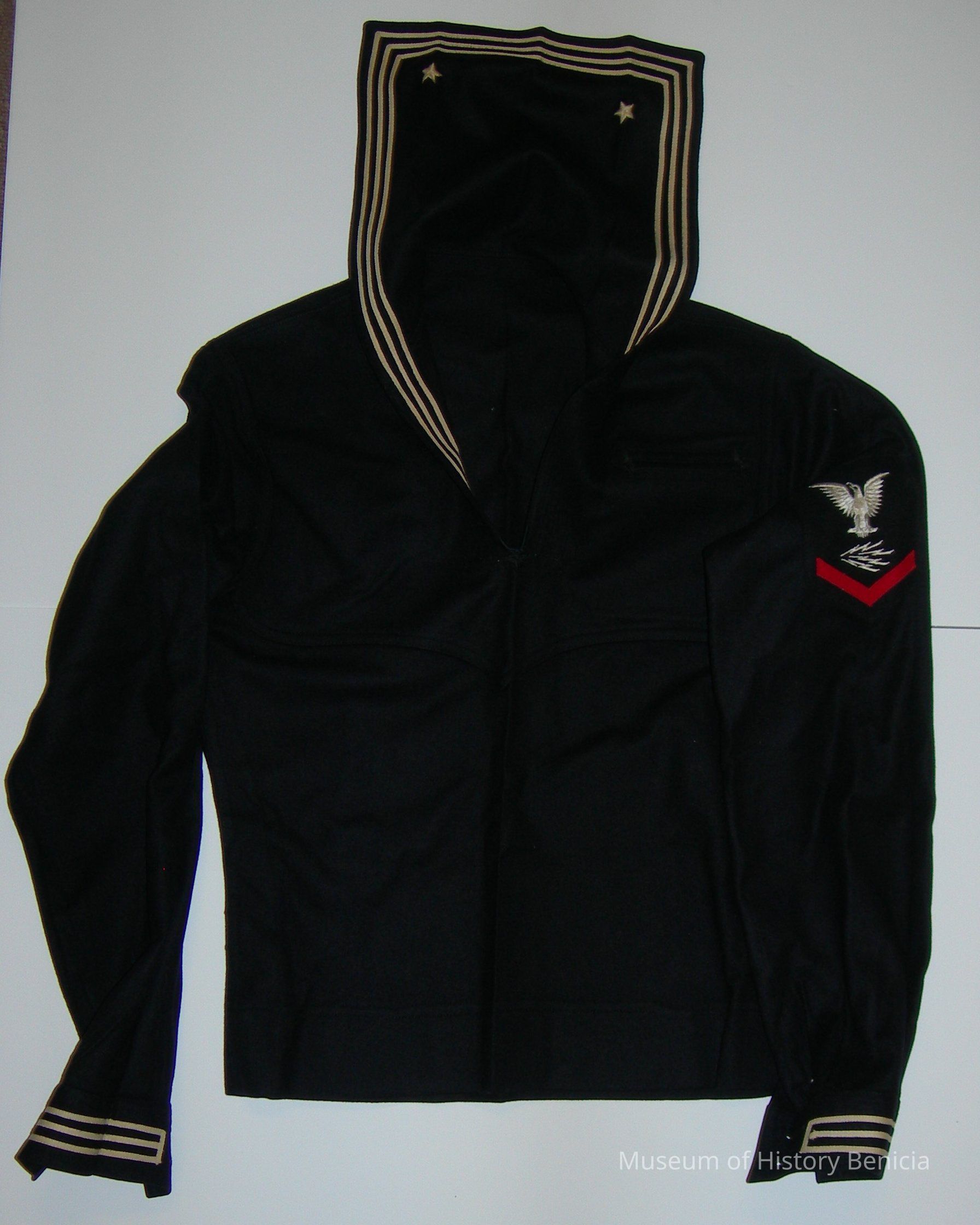 Wool, Navy uniform jumper (upper portion of the uniform); manufactured by Naval Clothing Factory, 100% wool; space for Name and Service No. on label at back of neck under collar flap (label spaces are blank); there are three rows of white piping around collar flap (with a star in each lower corner at back) and sleeve cuffs; pocket on left front breast and one with a button on the inside; on upper left sleeve: white spread-wing eagle (also called a "crow"), Radioman insignia/rating (lightning bolts), and one red chevron/third class (indicate pay grade/rate); the name Larson P.O. is visible on label but is very faded.