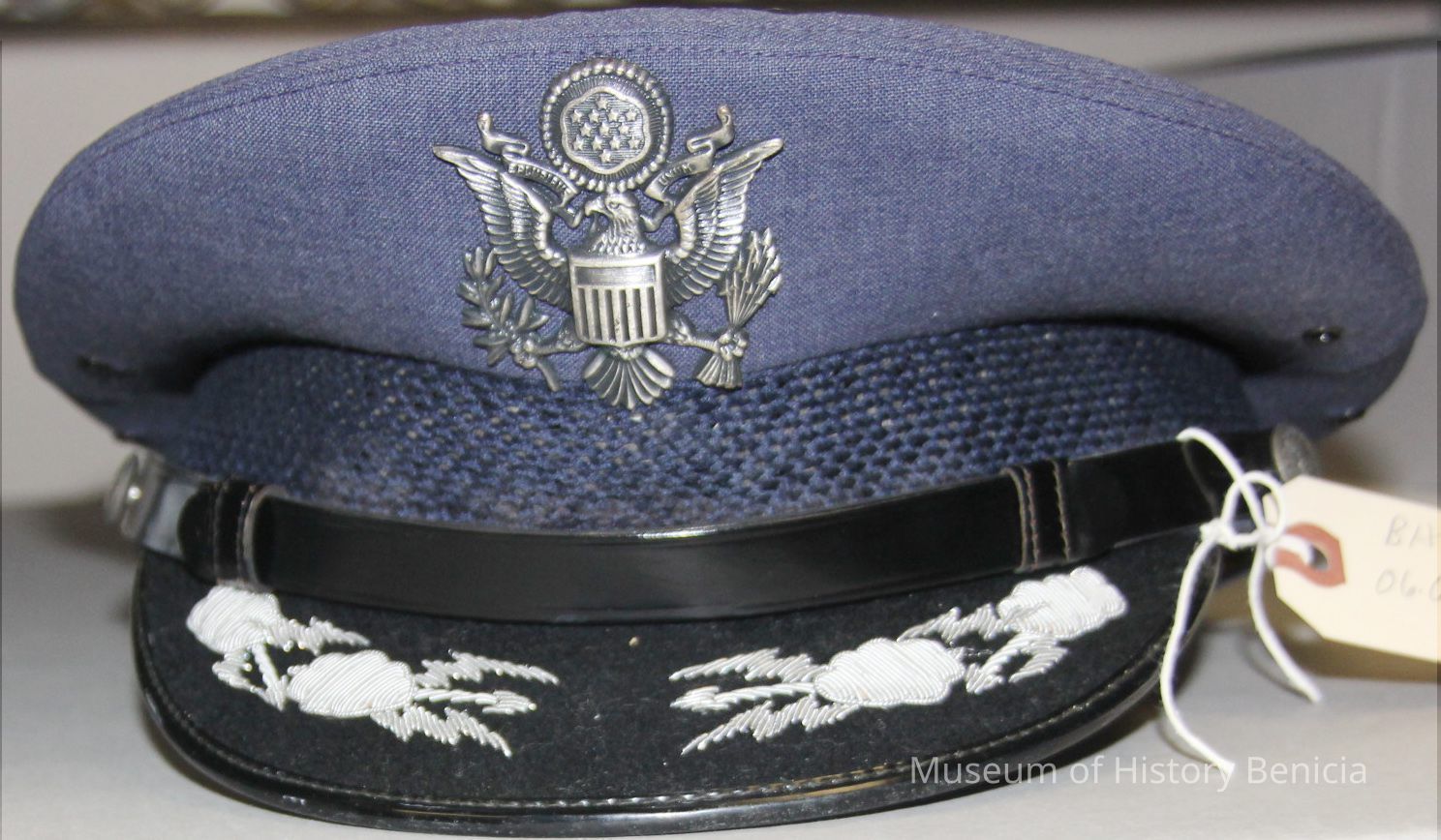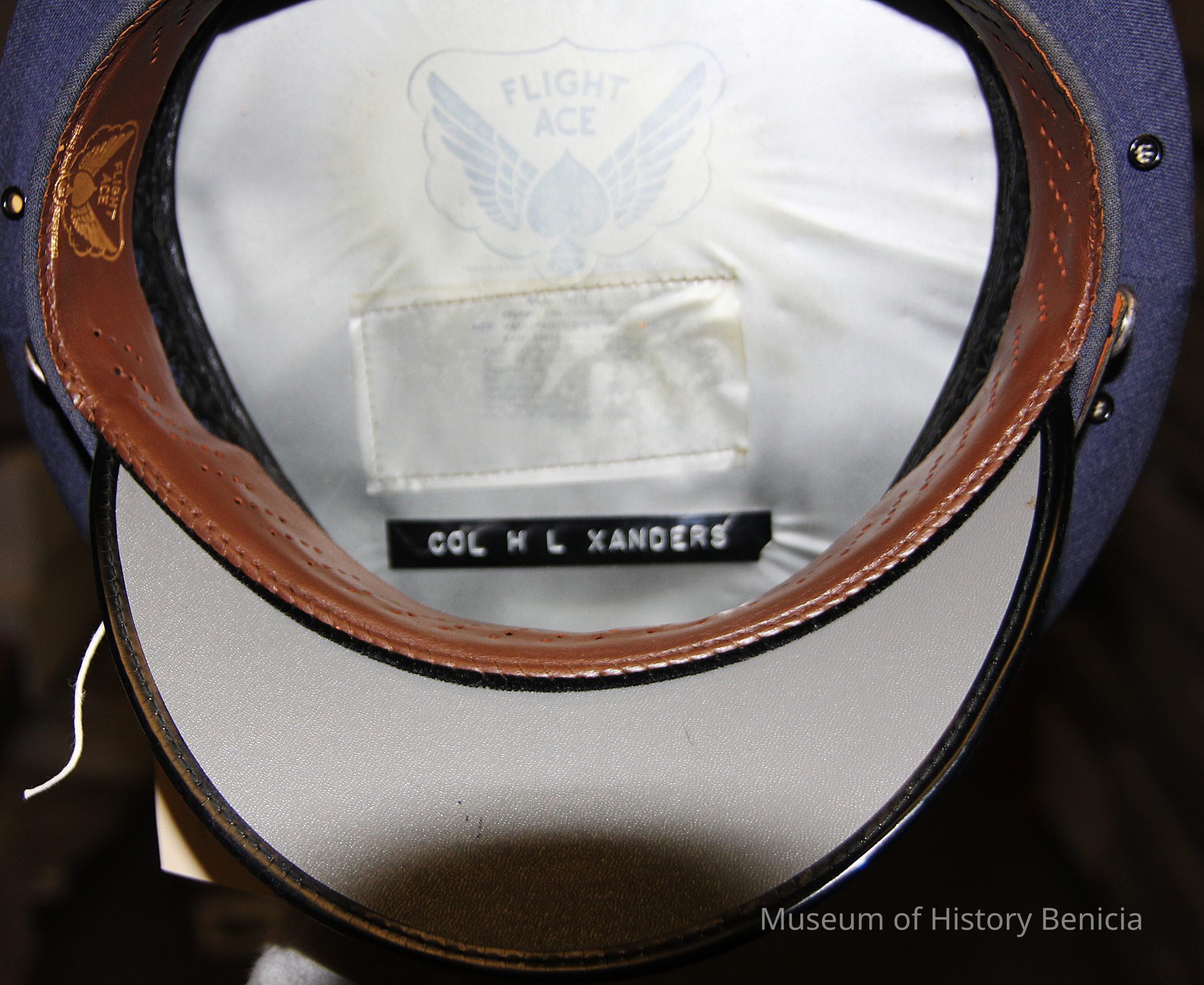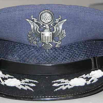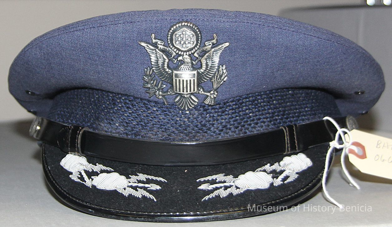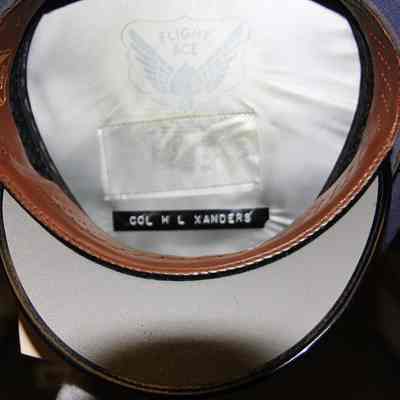 1 blue USAF hat. Col. H.L. Xanders on label inside. Silver eagle insignia in front. Silver stitched design on rim.