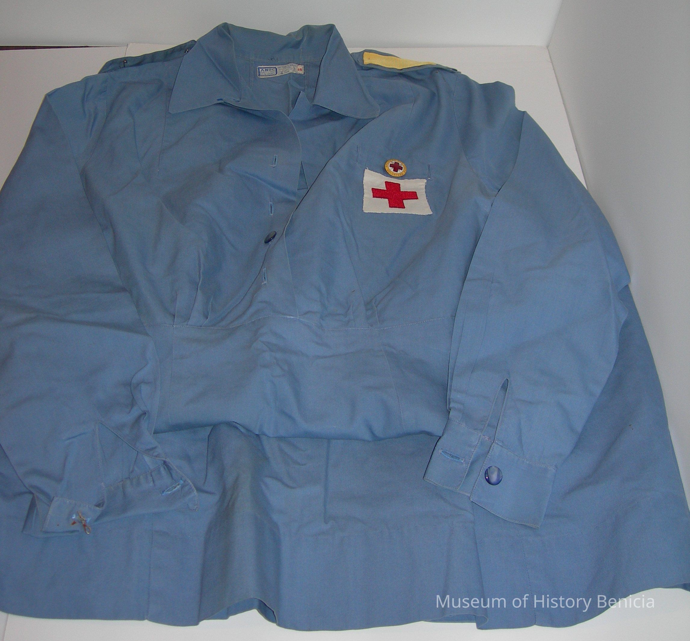 Red Cross Uniform dress, blue, long sleeves, collar, epaulets (gold ribbons pinned on), red cross on white square sewn on pock on left breast, fitted waist, four buttons, "shirt waist" style, zipper on left side, self fabric belt