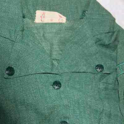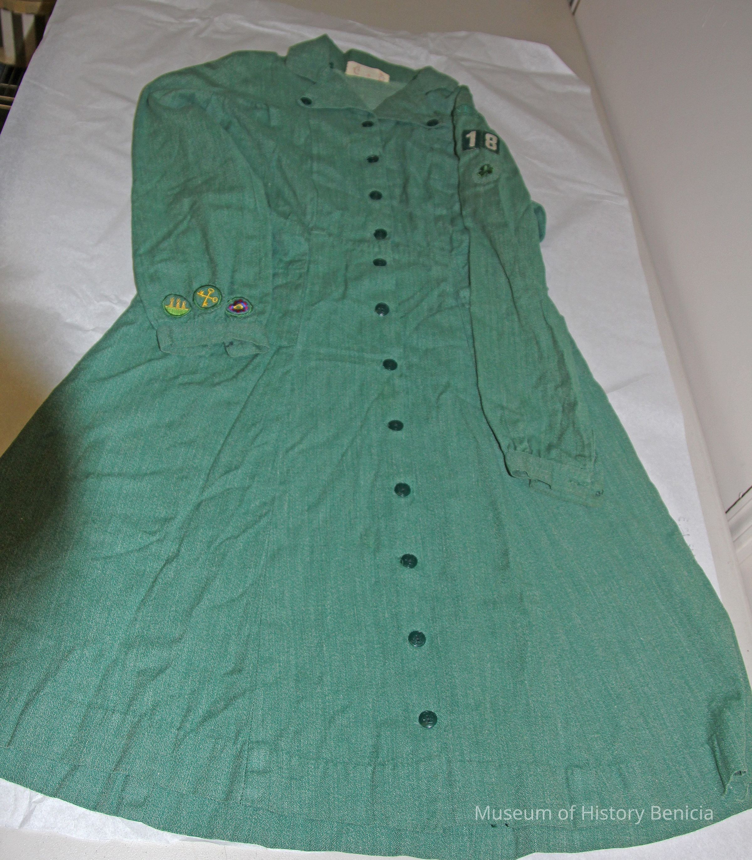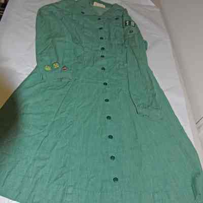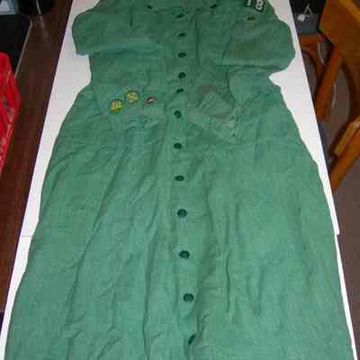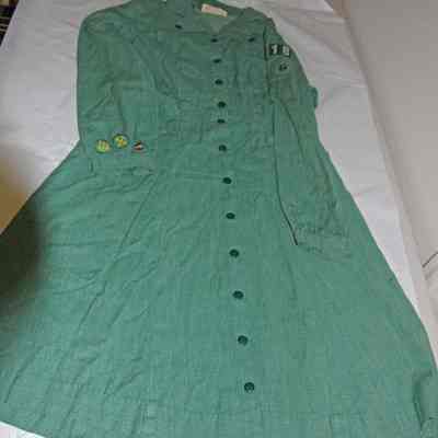 1950's era Girl Scout Uniform: green, long-sleeved (button at cuff) dress; button-up front;