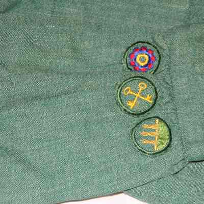 patches: right upper arm - (bird); right cuff - (haystacks, crossed keyes, red/blue/yellow flower);
