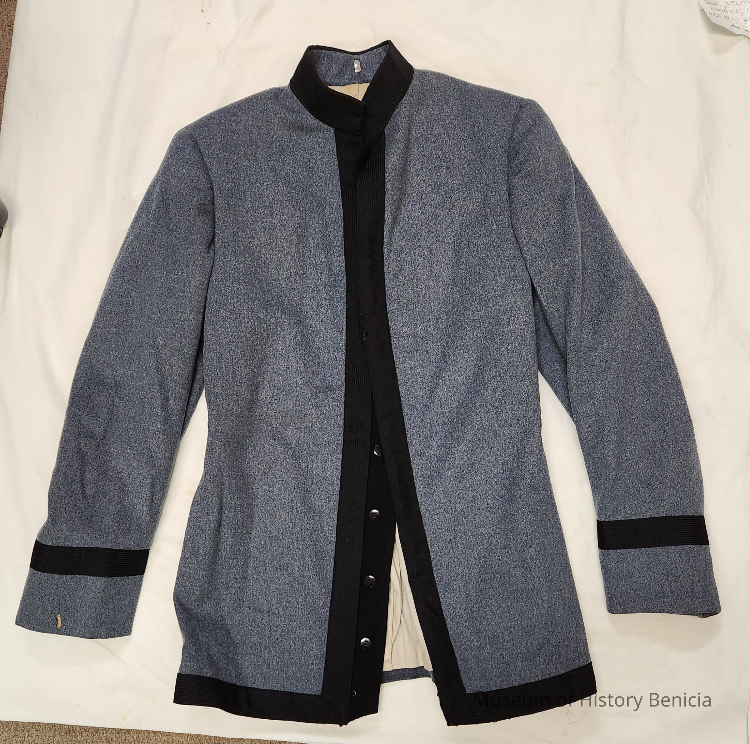 Blue-grey wool with black braid around neck, cuffs, front edge, hem and back seams. Eight button closures with three hooks. Grey cotton lining with inside pocket, armpit linersCollection