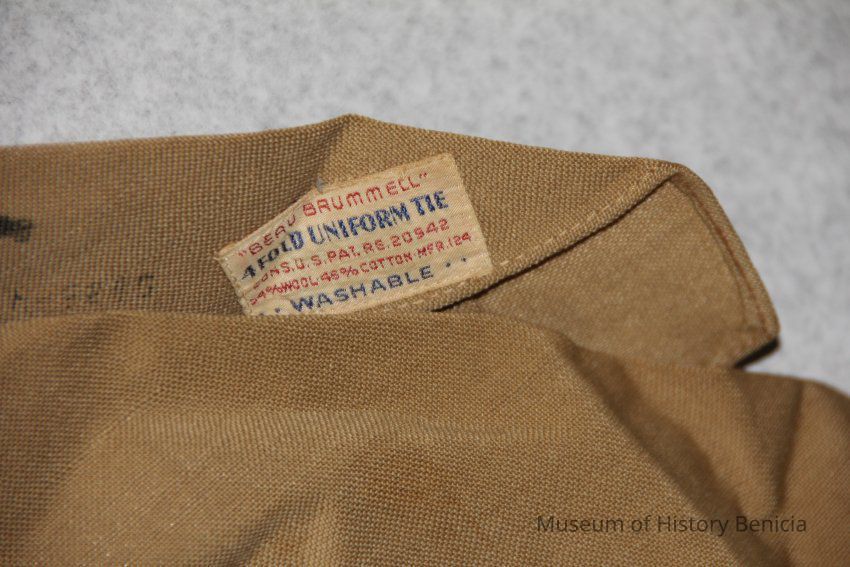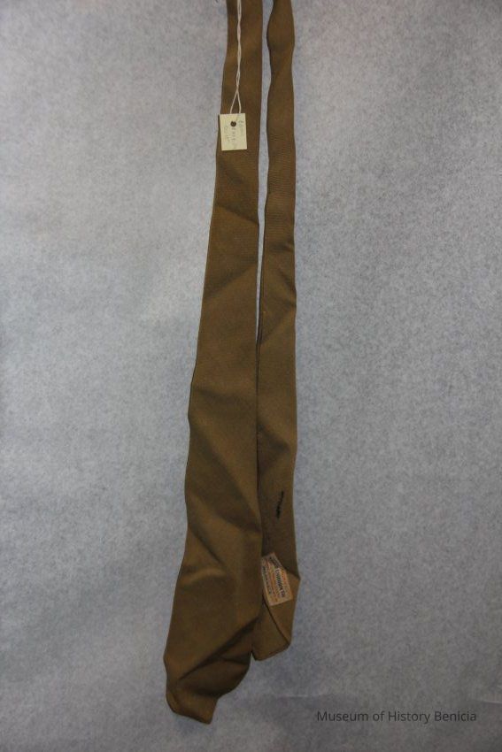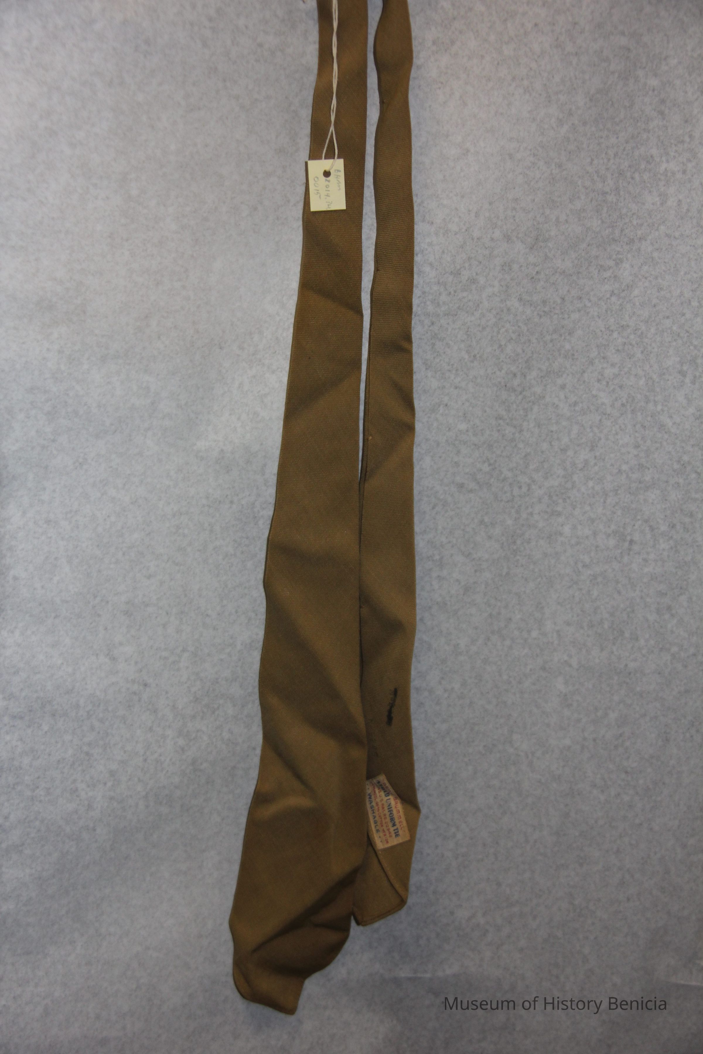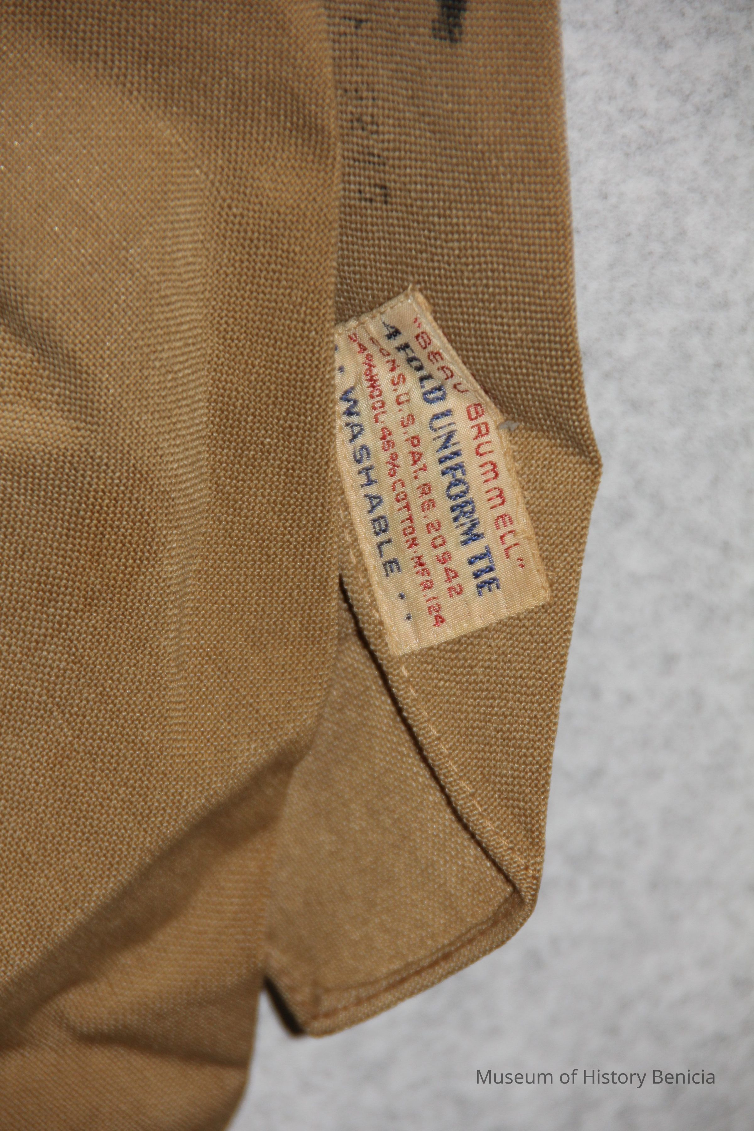 Green tie . Made of 54% wool and 46% cotton MFR 124. The tag says it is "Beau Brummel" 4 fold uniform tie. It has a Cons U.S. Pat Re. 20942. It was worn by Charles (Chuck) Hull.Collection