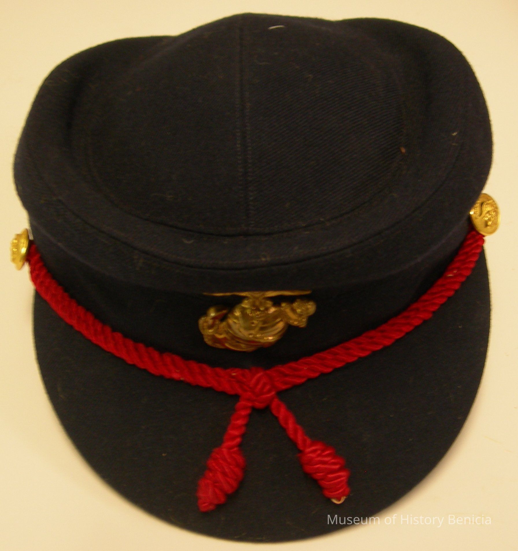 dark blue, gold/brass Globe & Anchor on front; also red braid tied at center front with a gold button holding it in place on each side; satin-lined, grograin ribbon around lower inside edge;