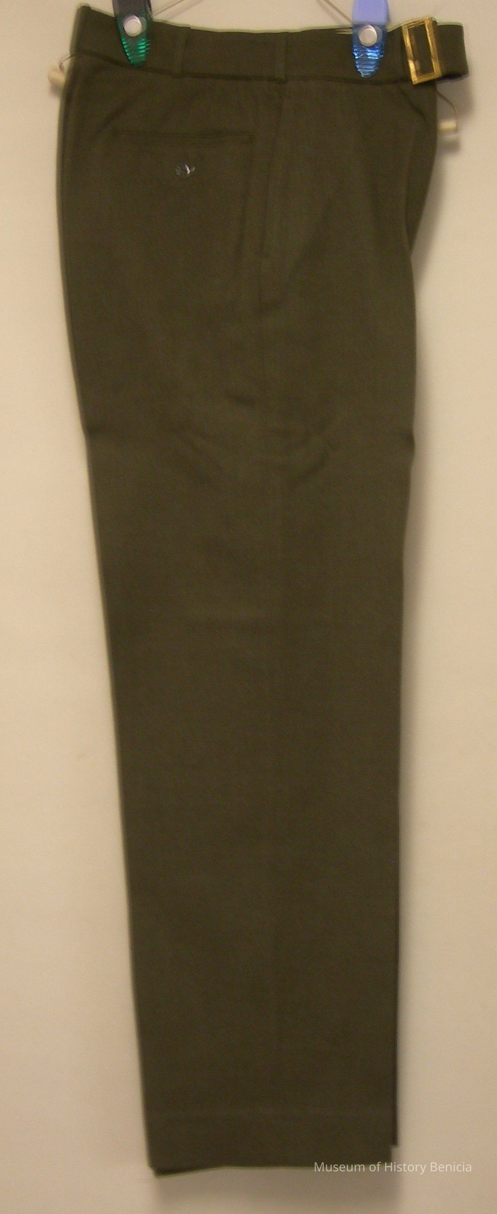 Army Uniform Pants, green twill with belt, zipper closing; name inside waistband: E.M. Sagear