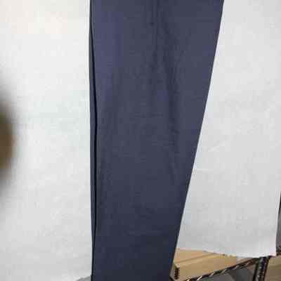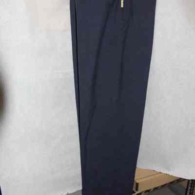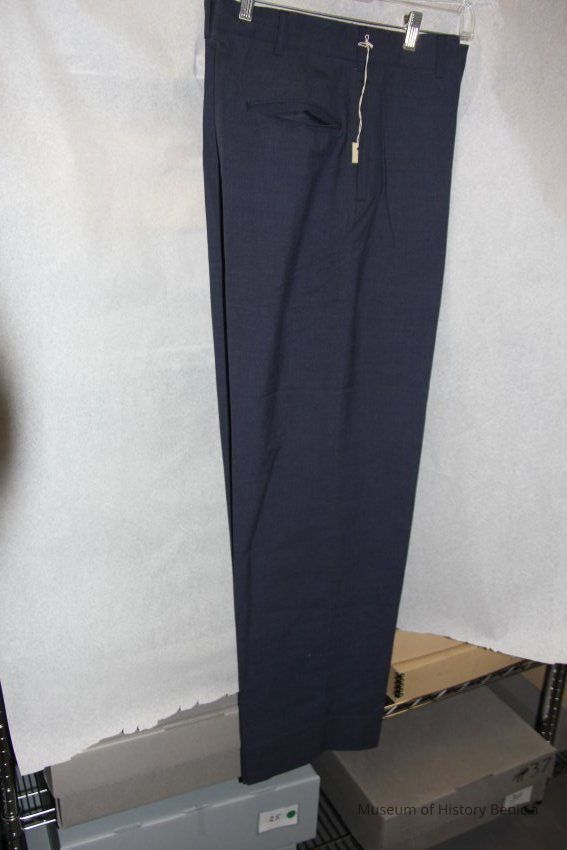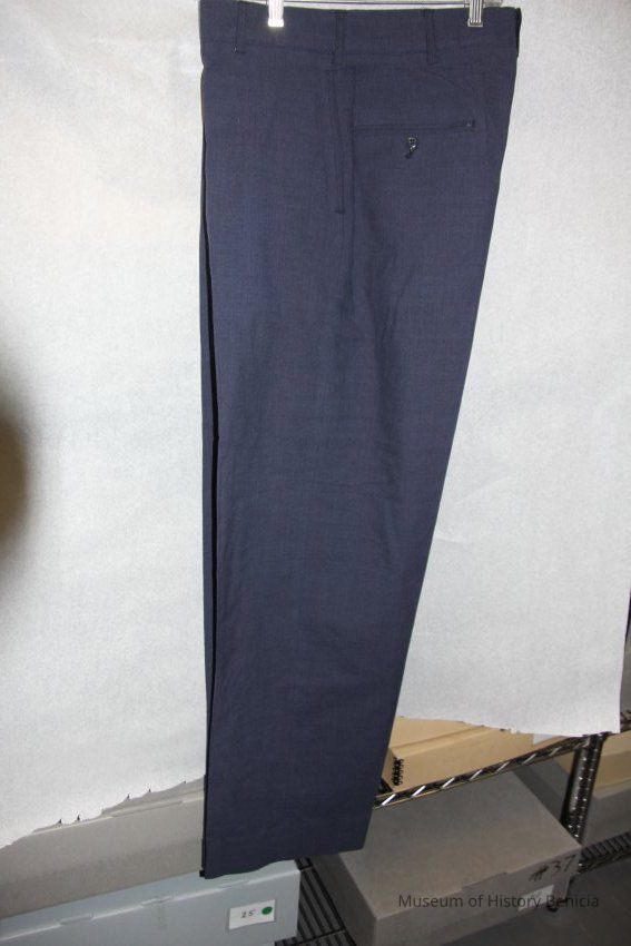 Blue pants, part of an Air Force uniform. The size is 34/36. There are no other identifiers. It was worn by Charles (Chuck) Hull.
