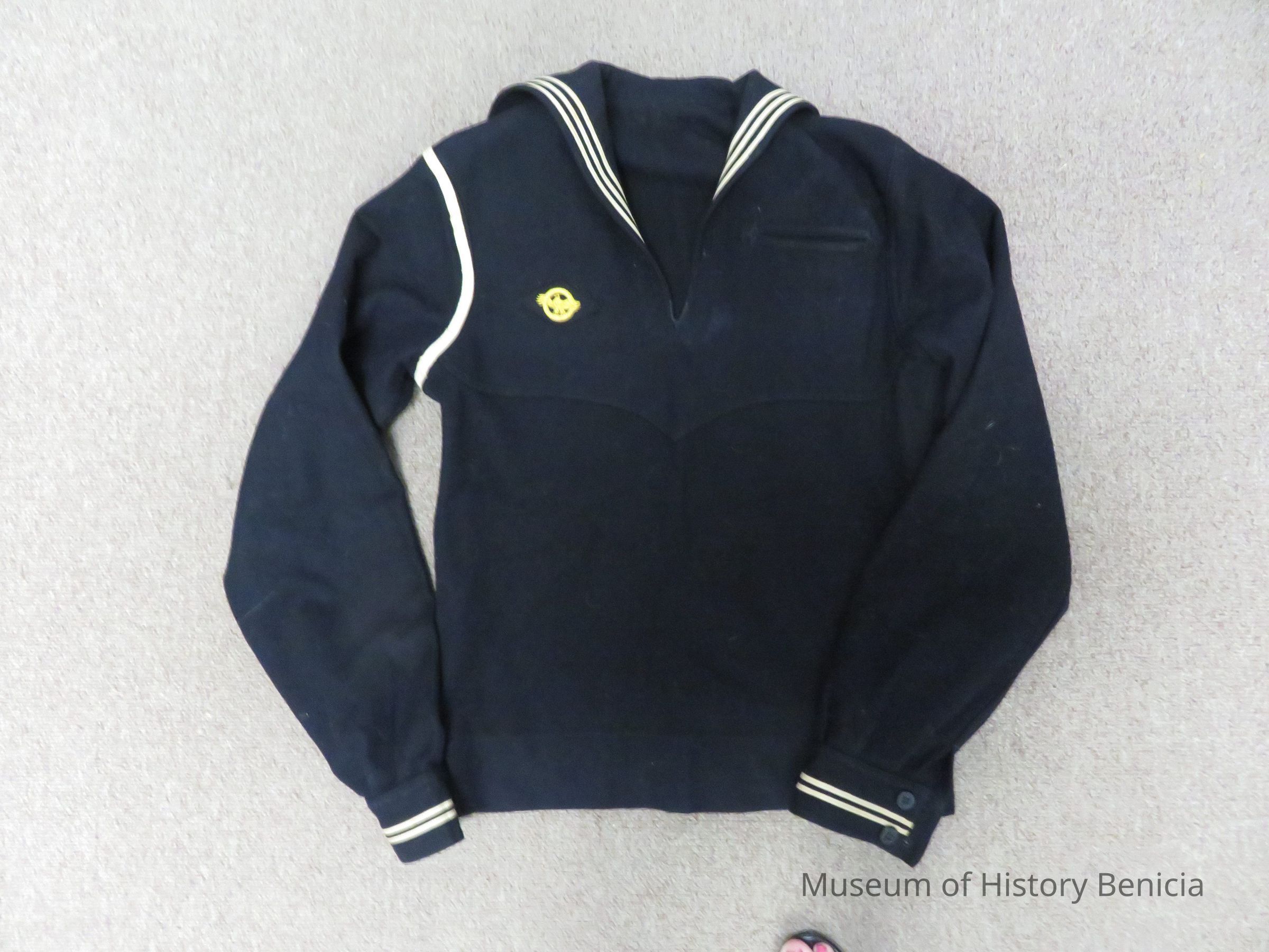 WWII U.S. Navy jumer with whte line of fabric around right arm and shoulder. Right shoulder fabric indicates seaman branch. Two stripes on cuff indicante seaman 2nd class.Collection