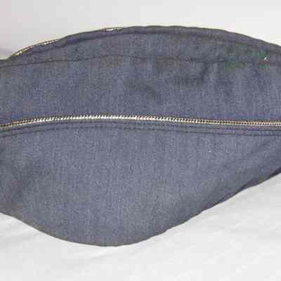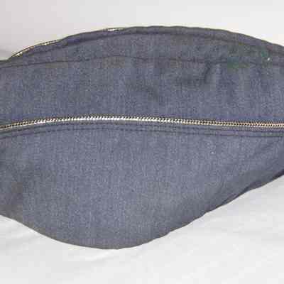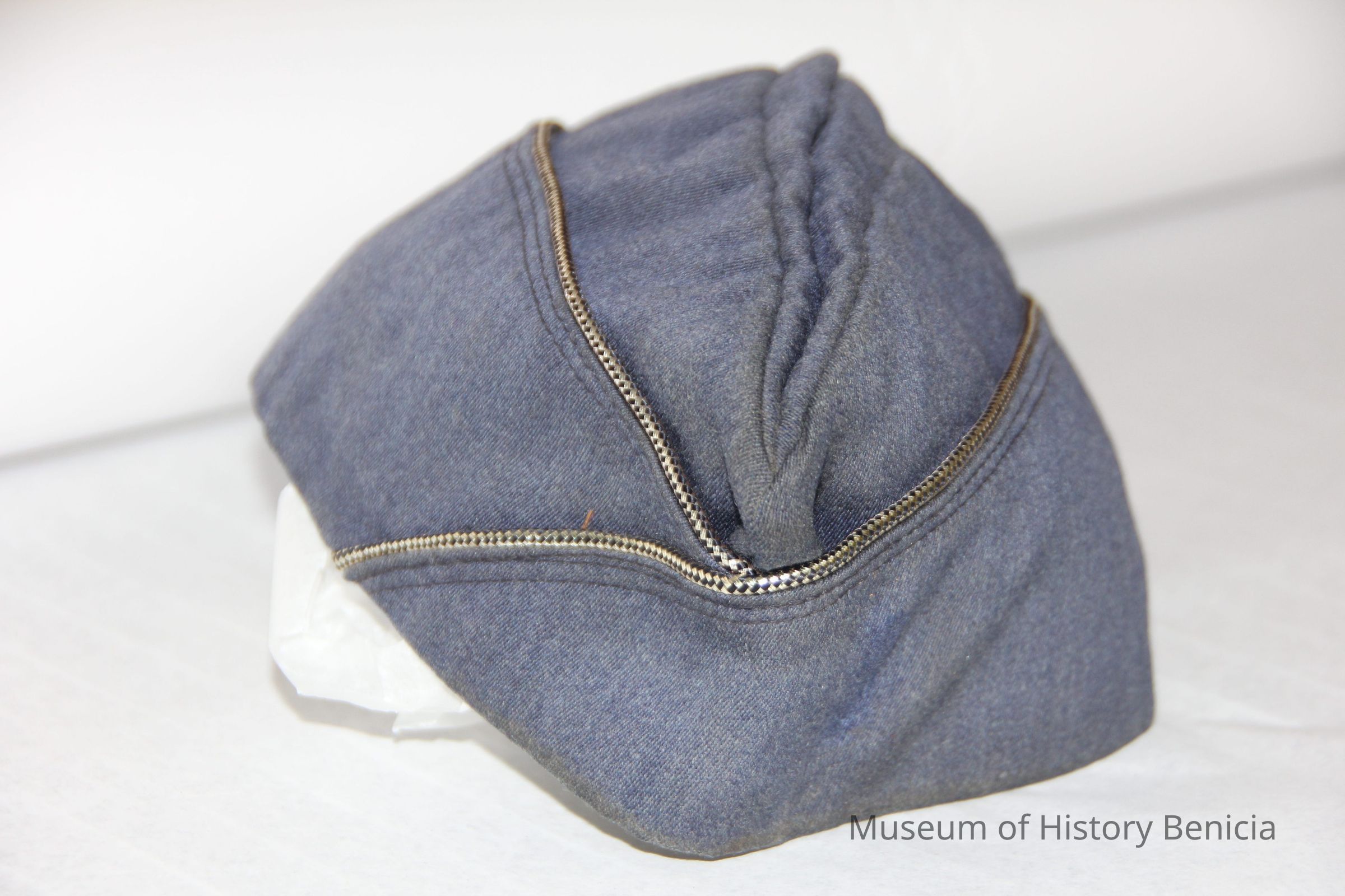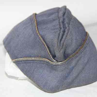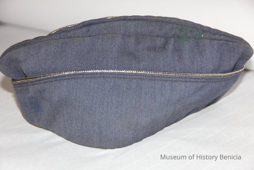 A blue Air Force cap with a silver stripping. Inside it says "Top Rank" It was worn by Charles (Chuck) Hull.