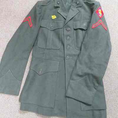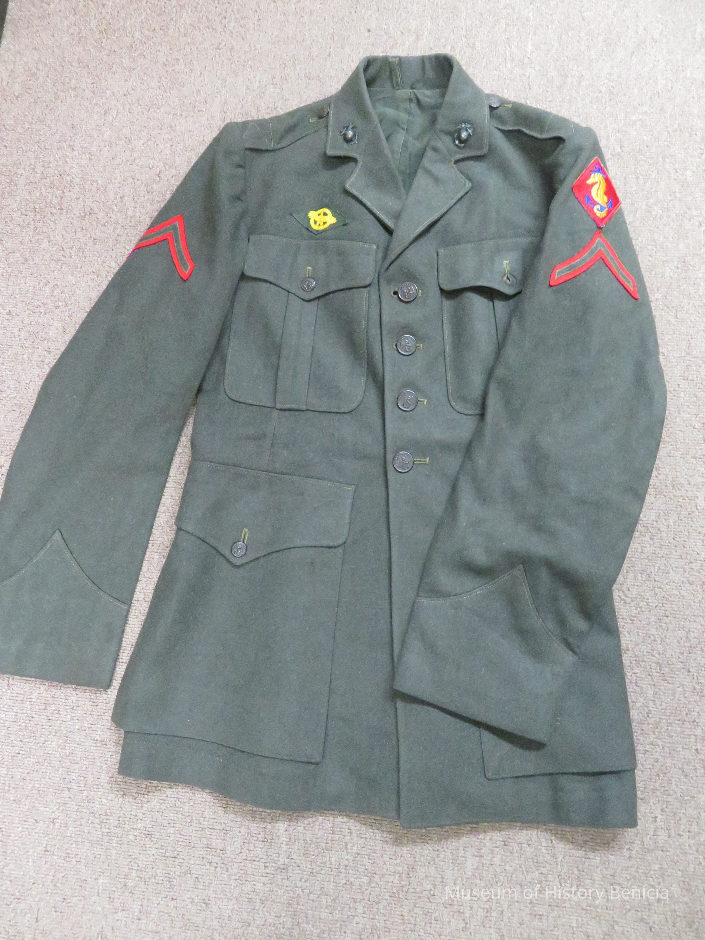 A WWII US Marine Corps combat uniform coat with one chevron - olive green with red border (PFC). On left arm is displayed a scarlet patch with gold seahorse on a blue anchor signifying ship assignment.Collection