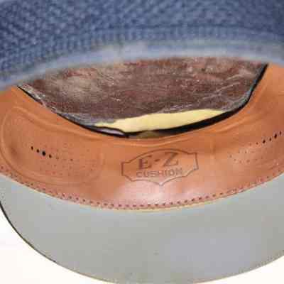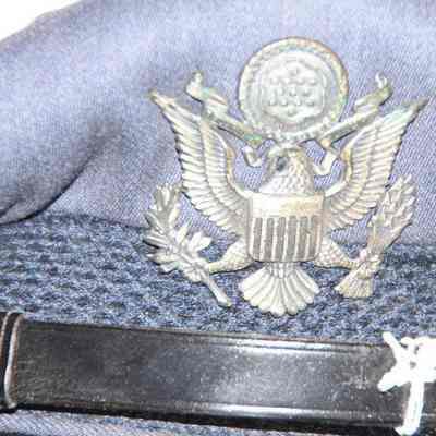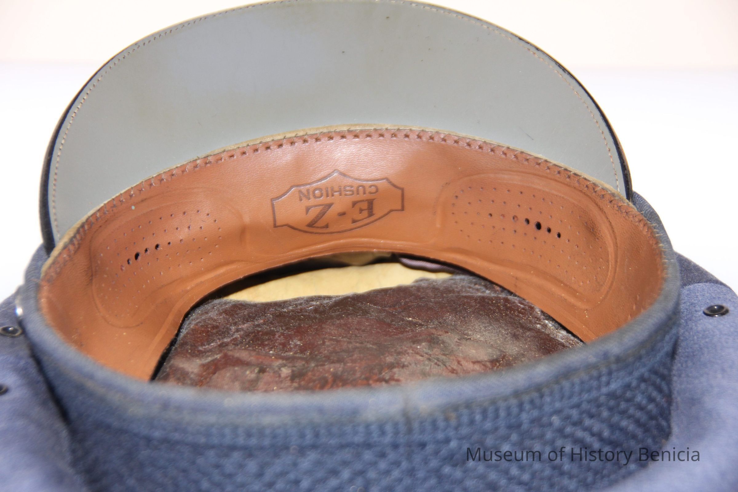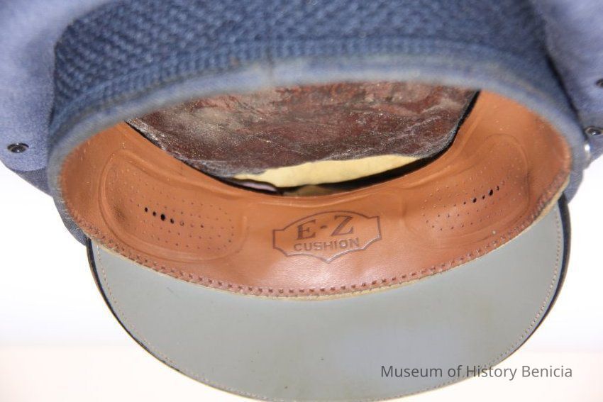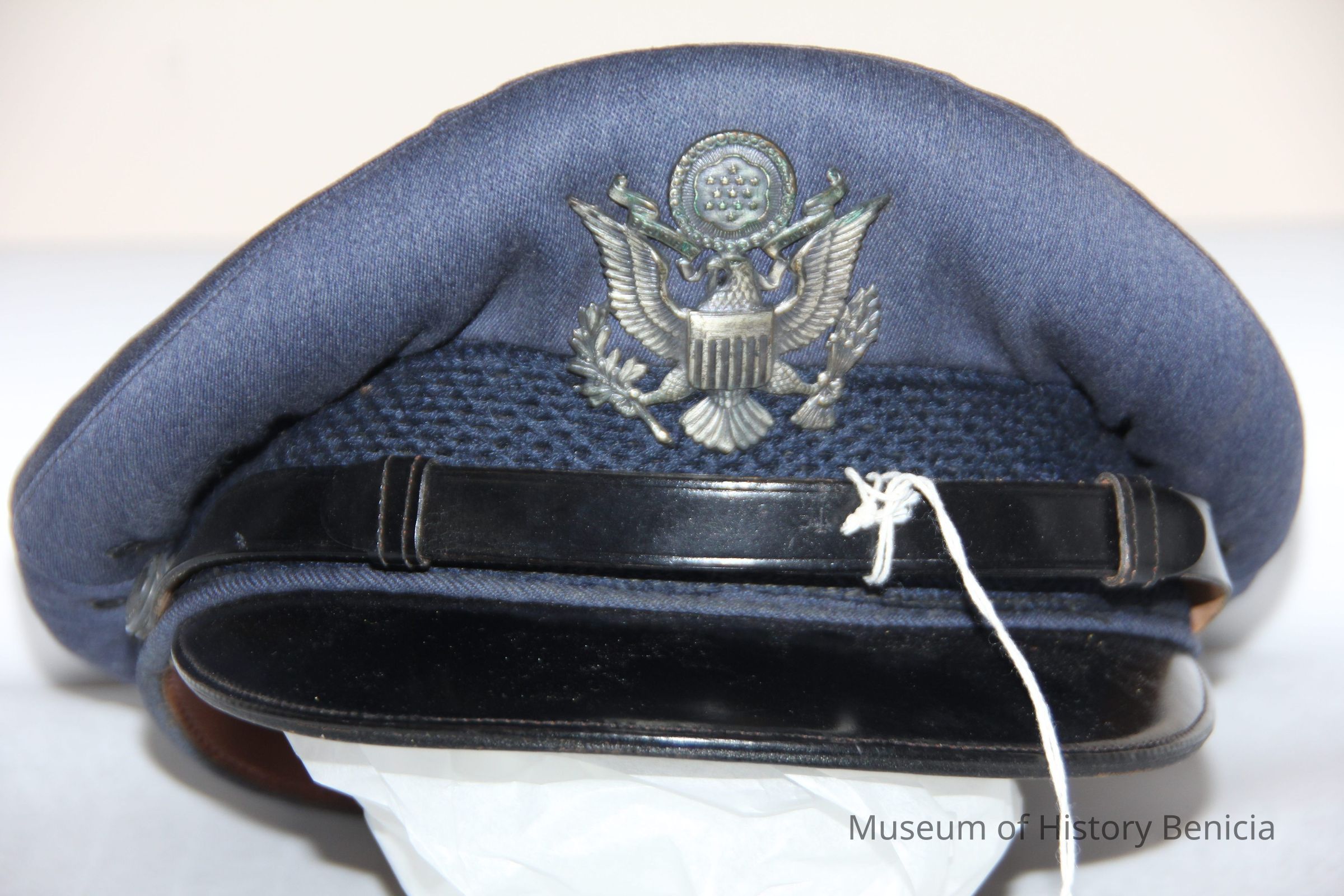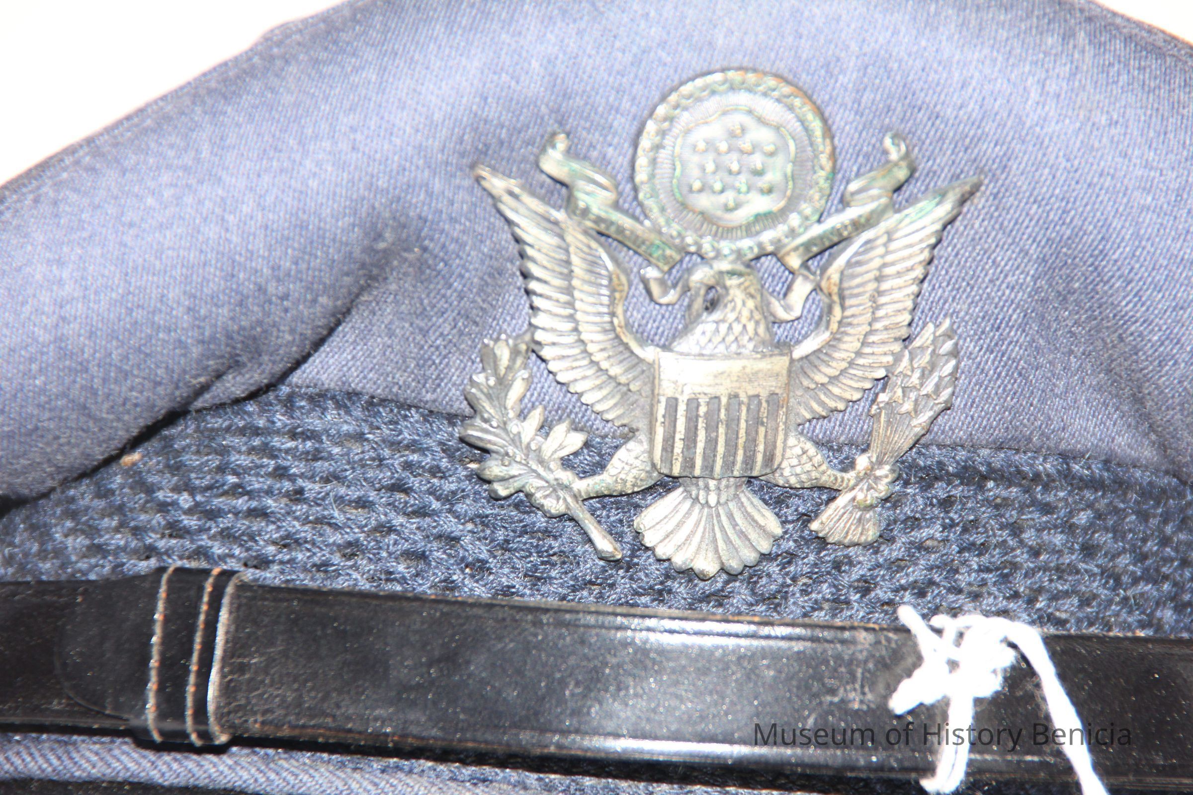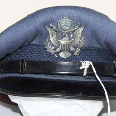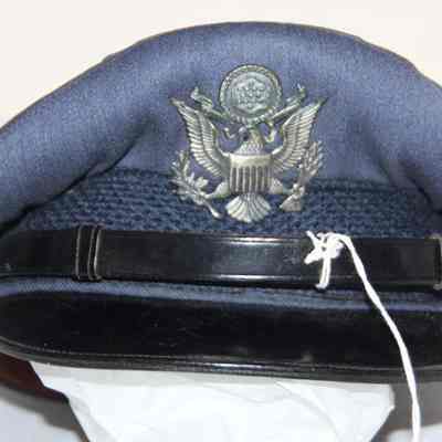 A blue Air Force hat with an Air Force eagle pin and a leathetr strap in front. Inside it says C.E. Hull and the name of the manufacturer which is too faded to read. It was worn by Charles (Chuck) Hull.Collection