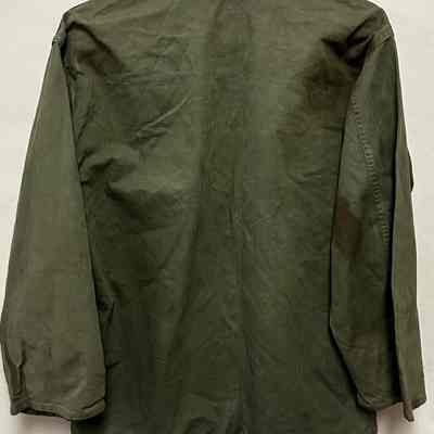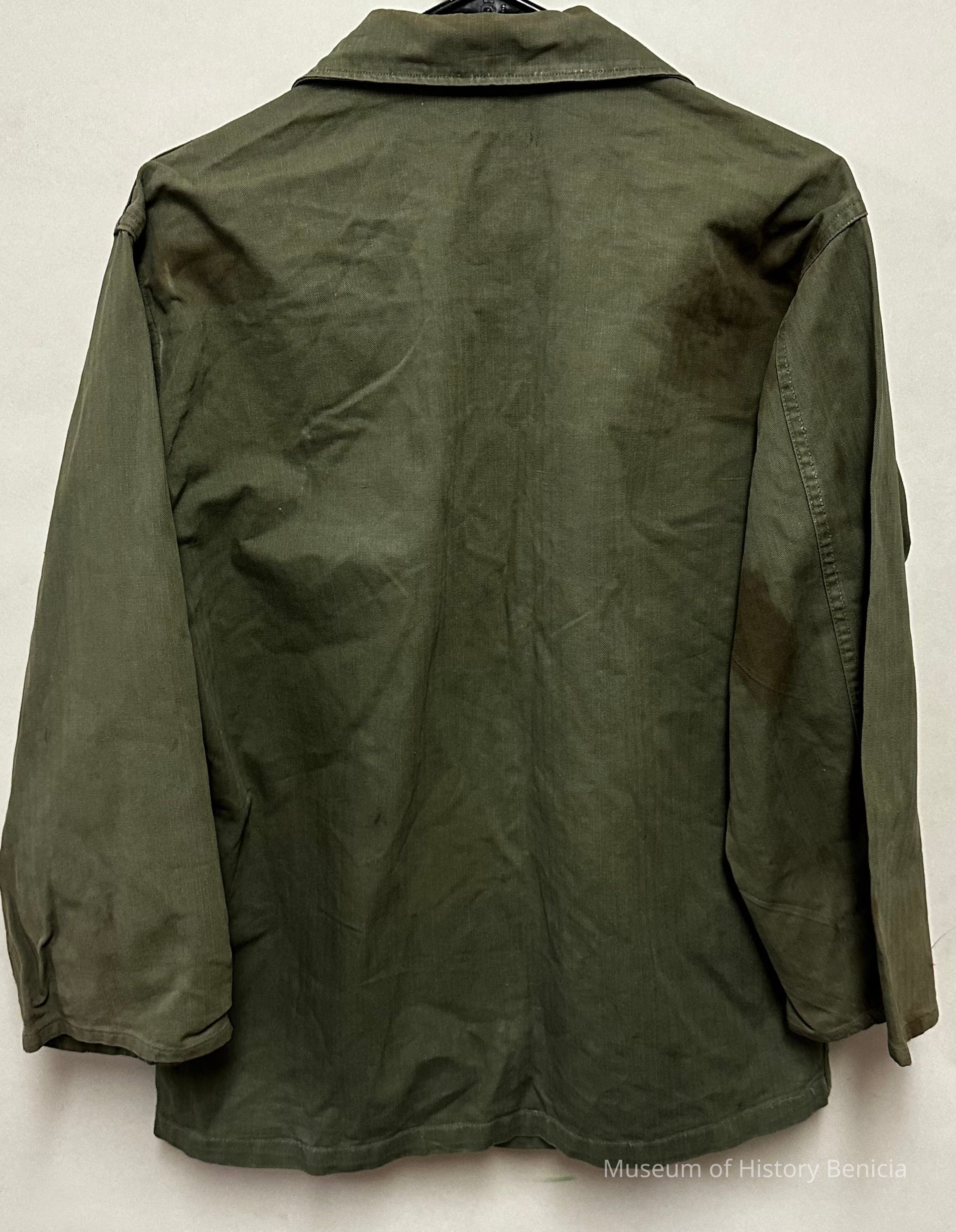 Army Private's Jacket who served in the 2nd Armored Division. Dark green fabric, two flap pockets on front, green buttons on front closure and pocket flaps.