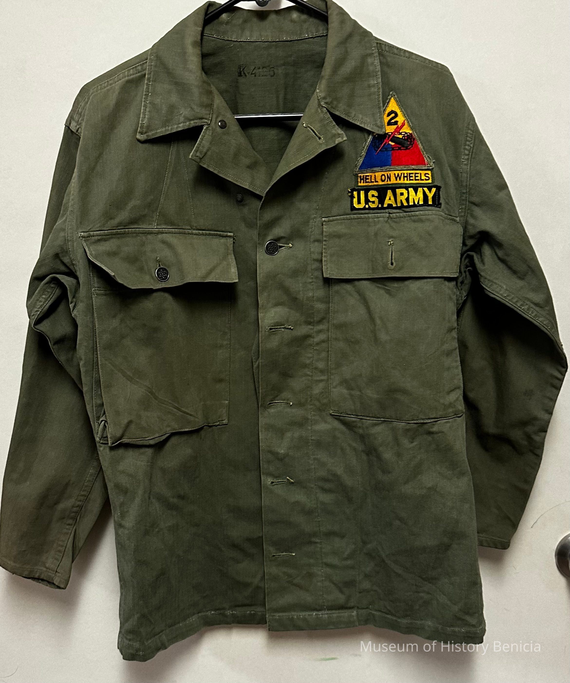 Insignia patch above left pocket: Triangular shaped with the number "2" and lightning bolt over cannon, "Hell on Wheels" and "U.S. Army".