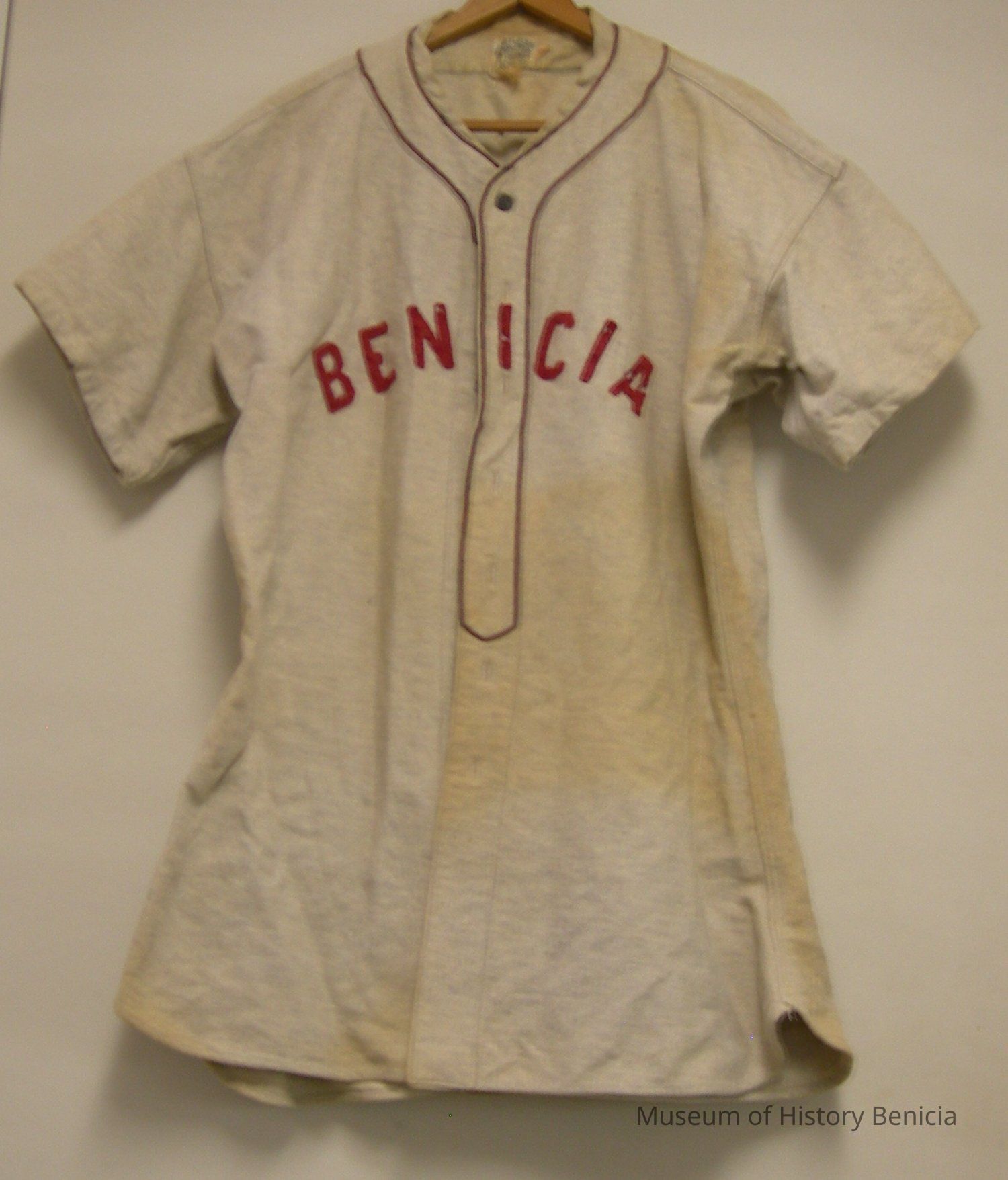 Collarless neck, seven buttons down the front; "BENICIA" across the chest, Number 11 on the back, short sleeves, shirt-tail cut at bottom,