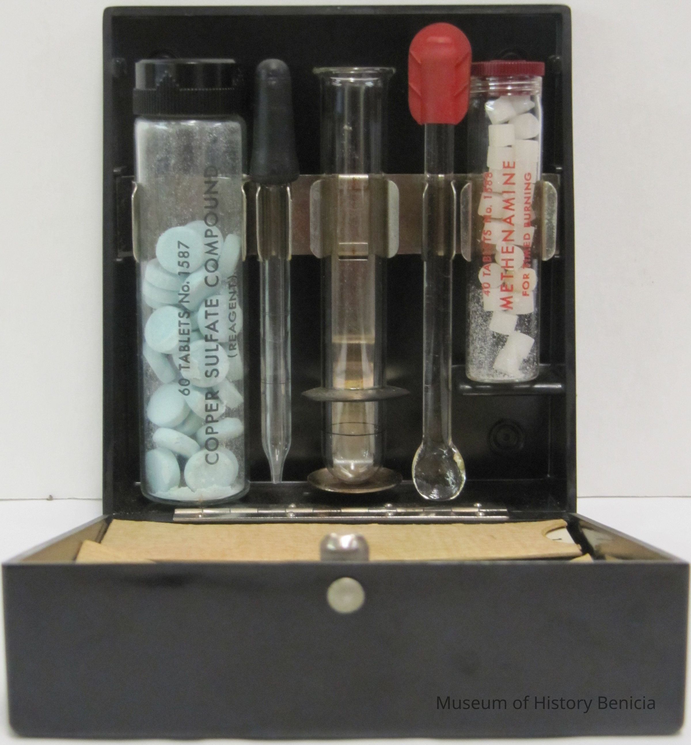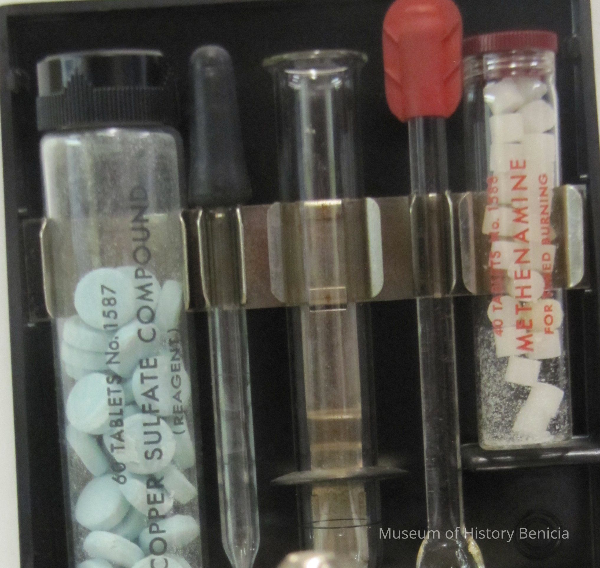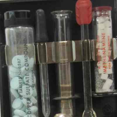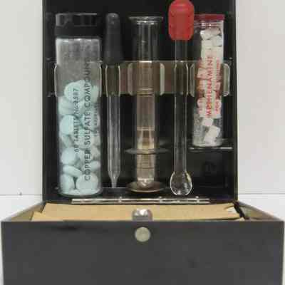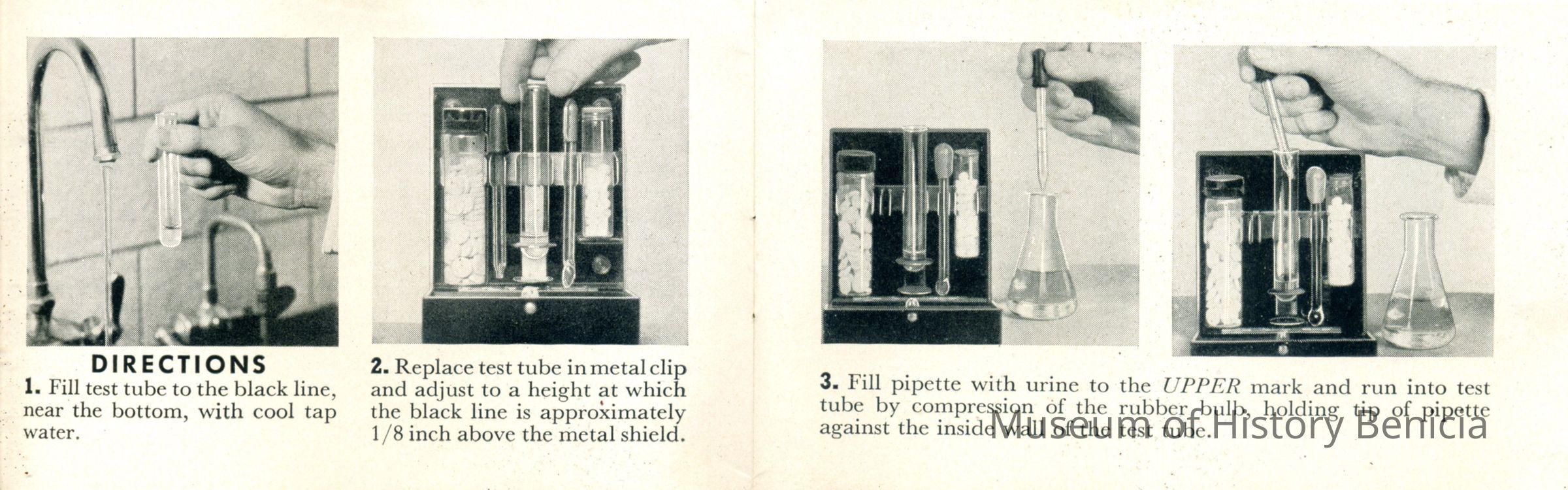 This is a small case containing a Urine Sugar Test kit made by the Eli Lilly Co.. It is made based on a method developed by Dr. A.G. Sheftel. It contains a glass bottle containing copper sulfate compound tablets, an eyedropper, a test tube, a glass handled spoon, a color chart and a glass bottle containing Metheamine tablets.Collection