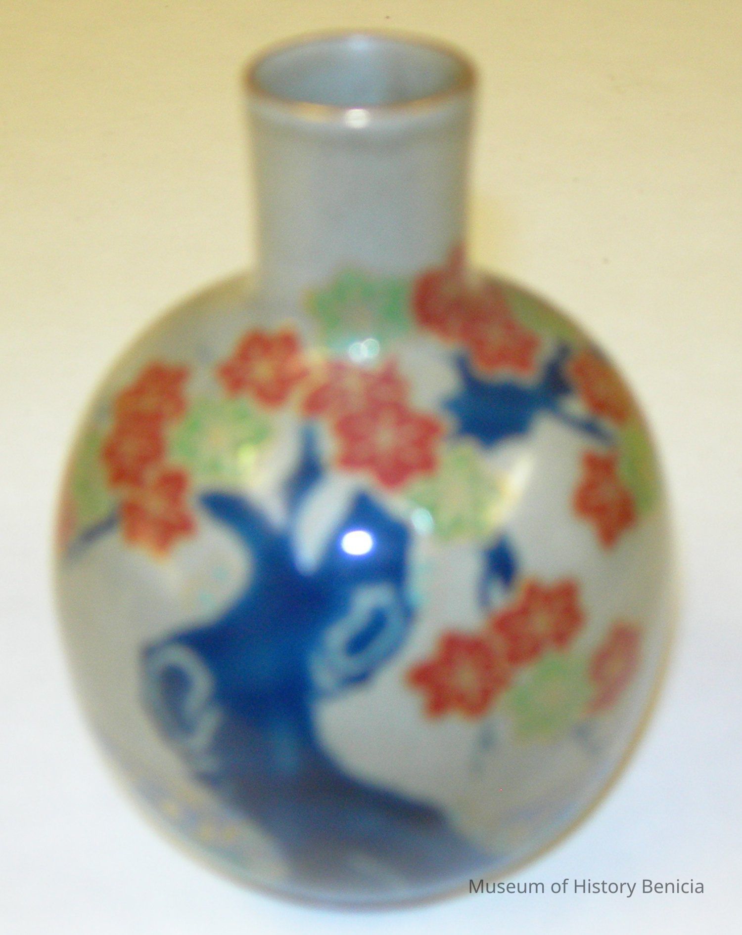 Oriental design china vase; has blue tree pattern on gray background with red flowers and green leaves and a green area at the bottom; some gold trimCollection