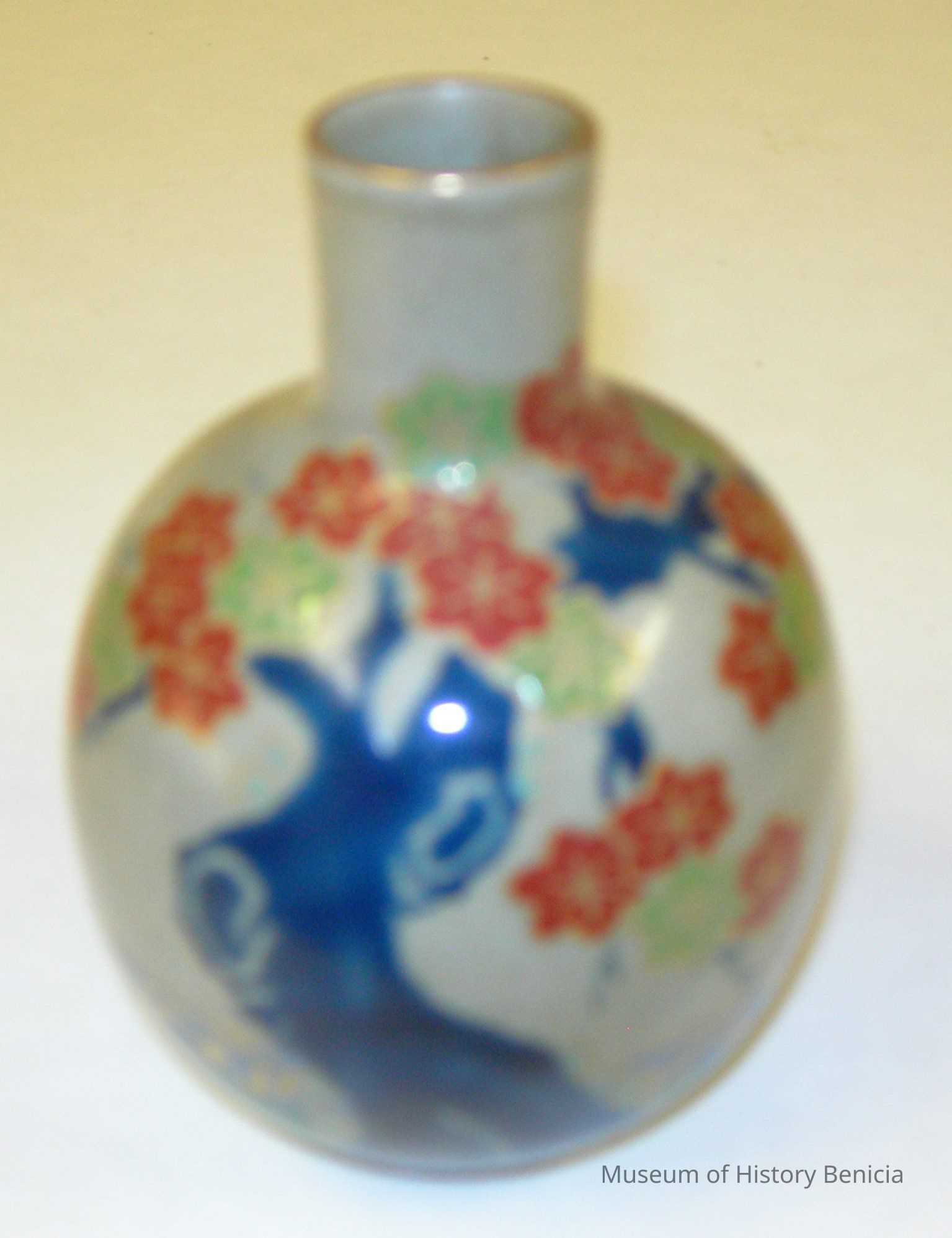 Oriental design china vase; has blue tree pattern on gray background with red flowers and green leaves and a green area at the bottom; some gold trimCollection