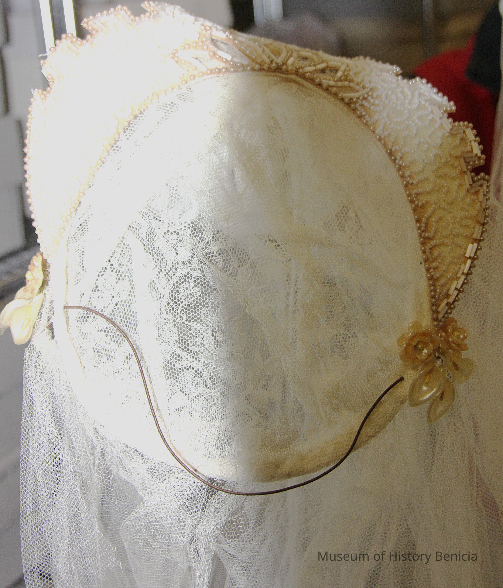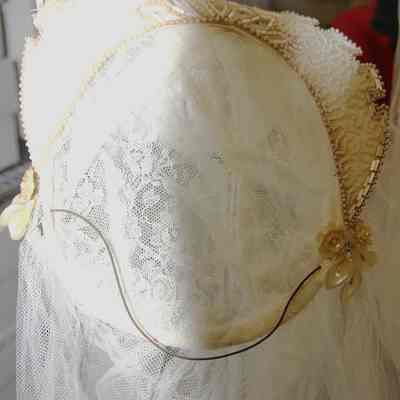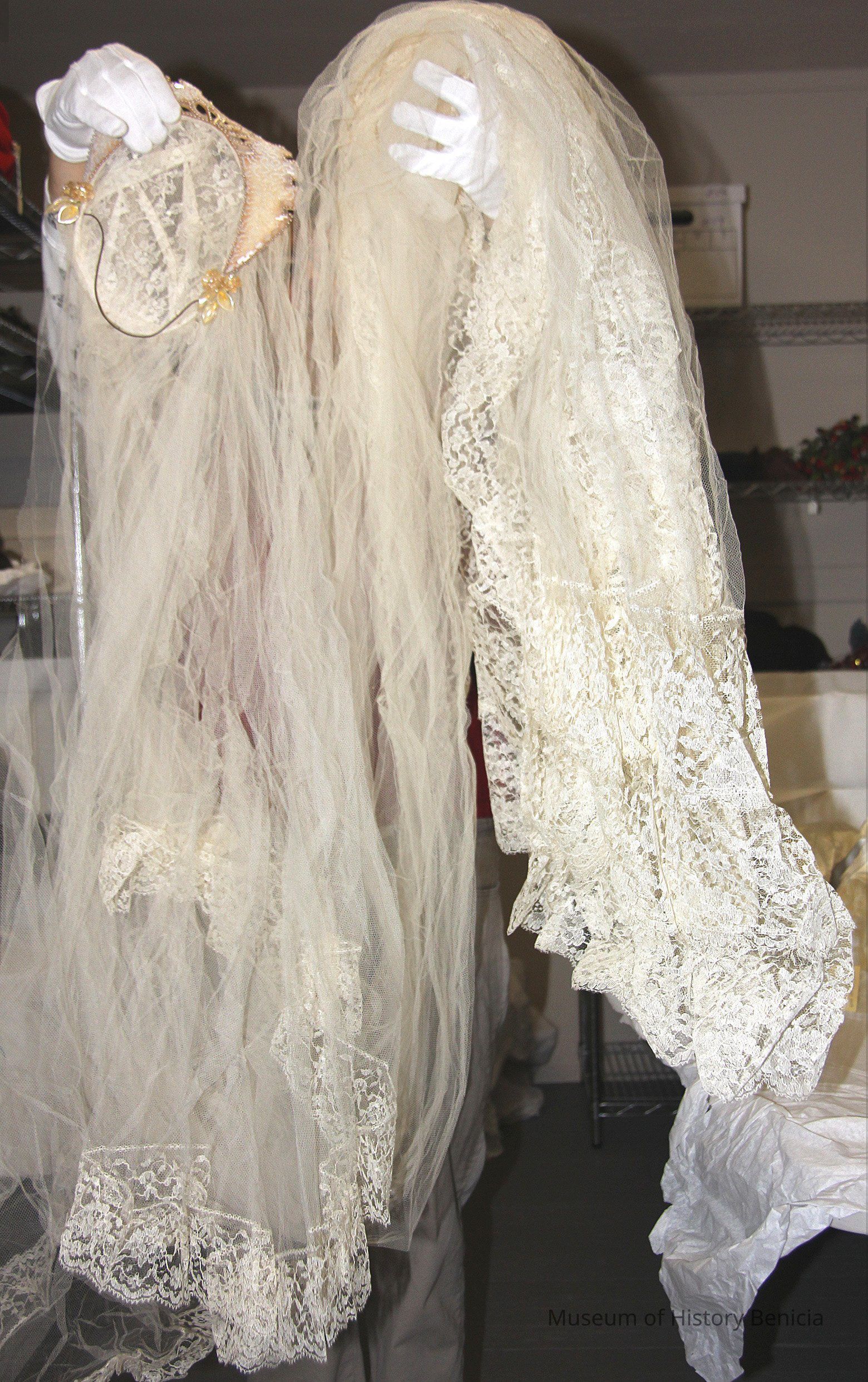 White lace train and head piece with crown worn with wedding dress (turned yellow) long-sleeved, brocade-like satin, by Hortense nee Coreia Nunn on August 30, 1941