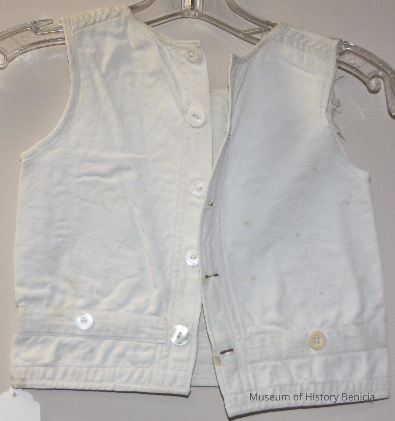 White heavy cotton / youth size vest / mixed natural buttons.
