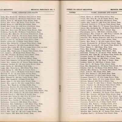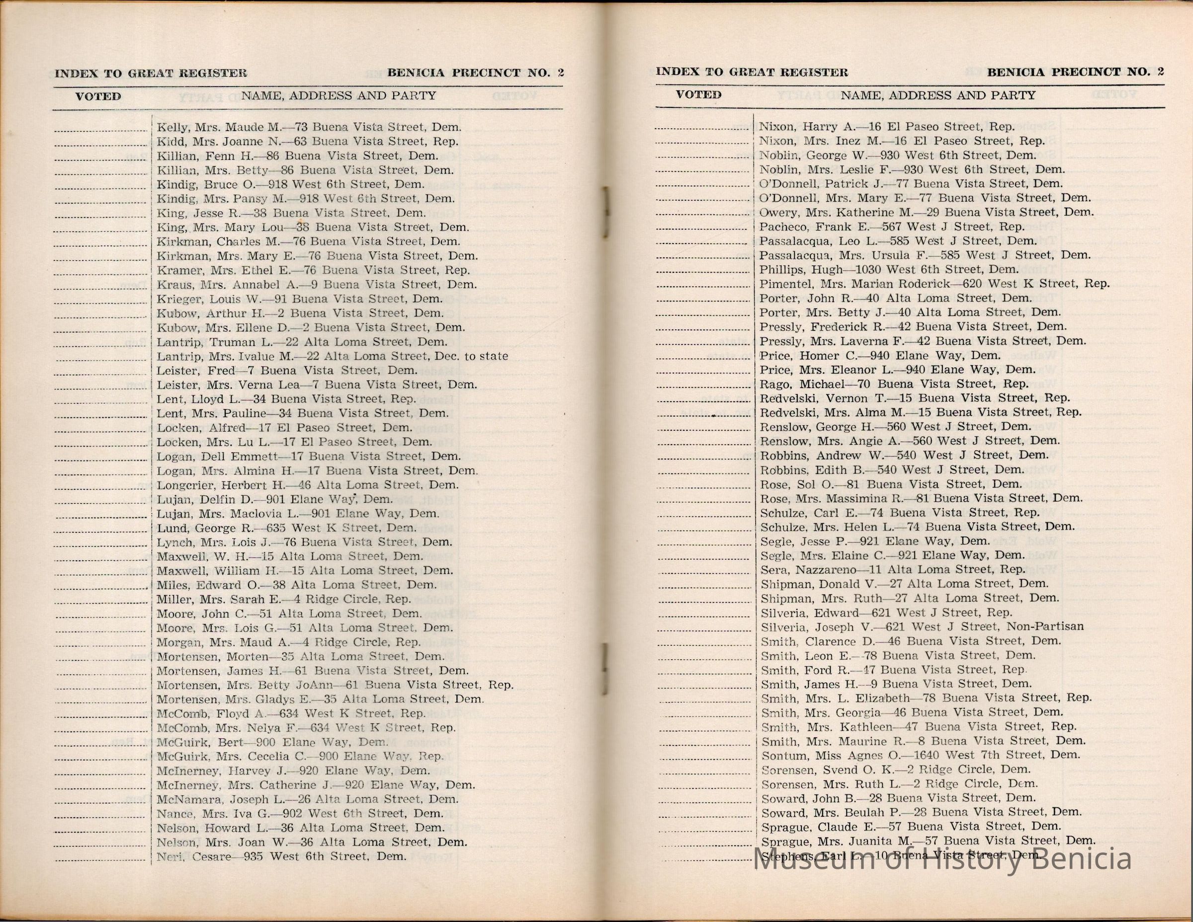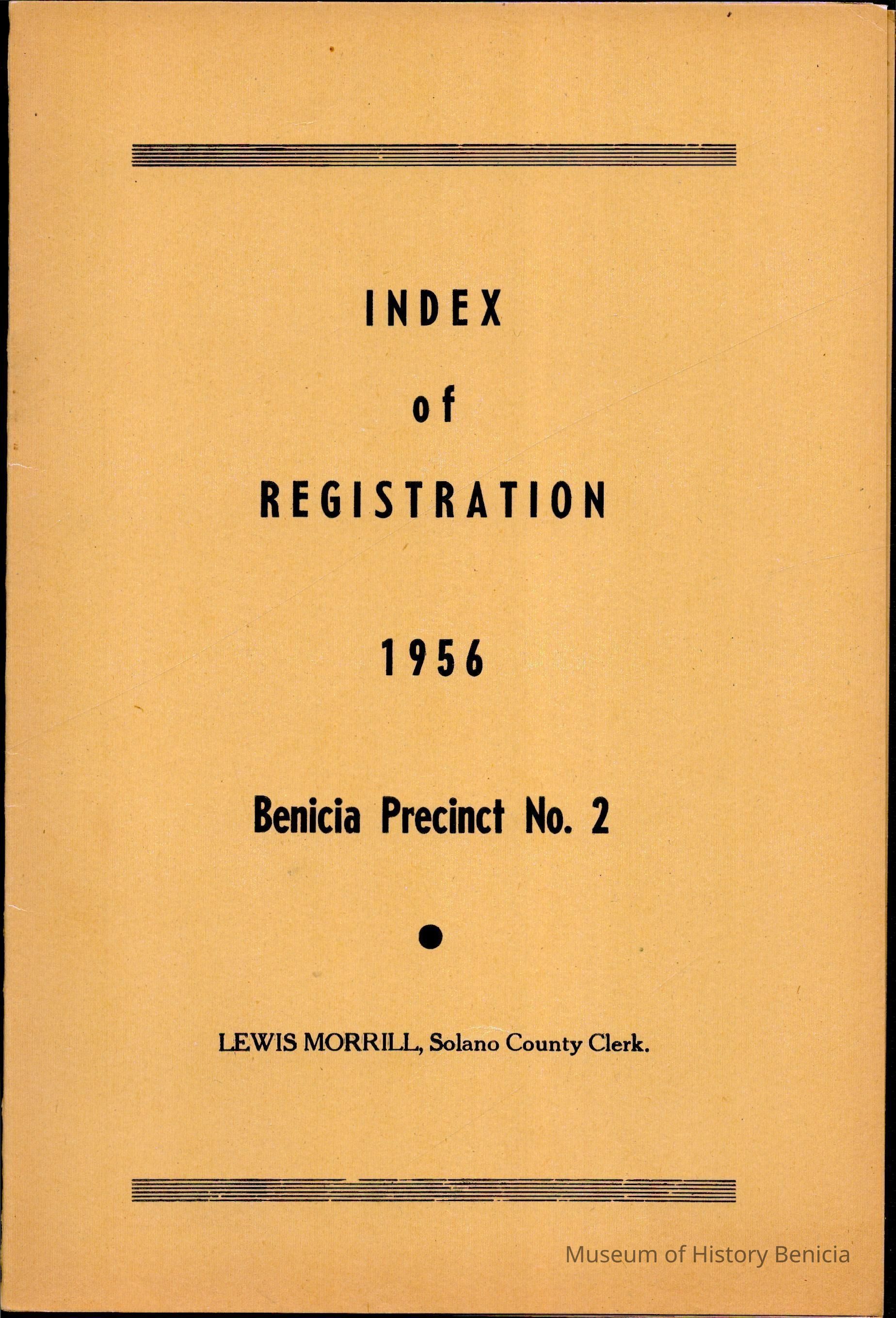 The 1956 voter index of registration for Benicia Precinct No. 2. It lists all voters by name with their address. The field showing if they voted is not filled in.Collection