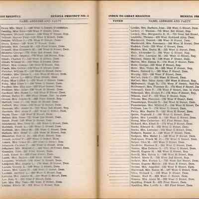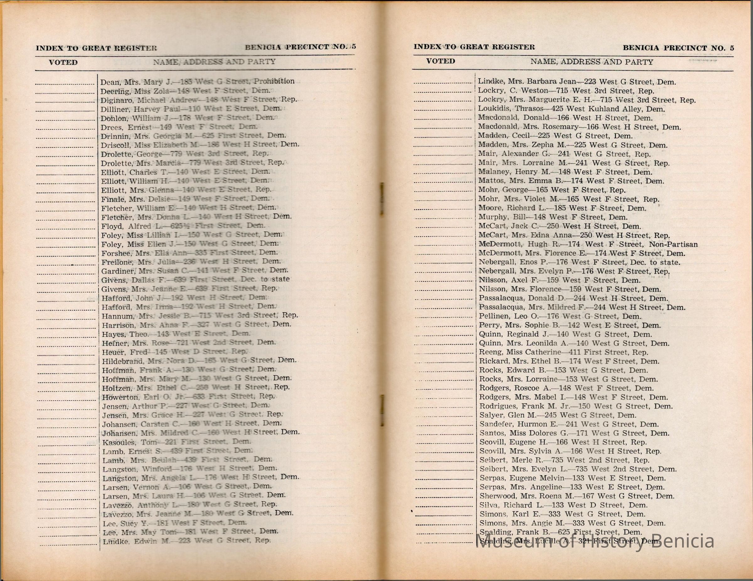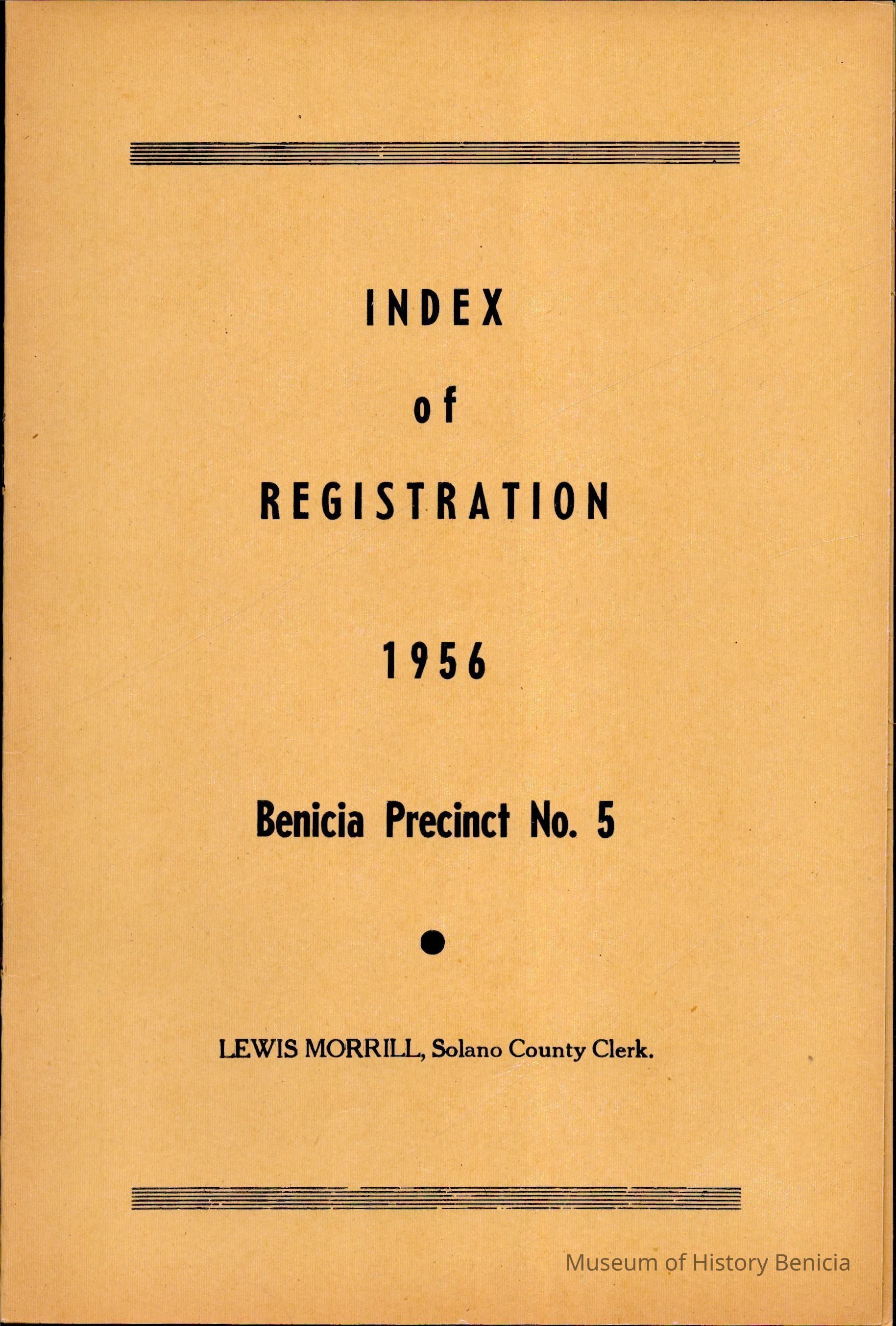 The 1956 voter index of registration for Benicia Precinct No. 5. It lists all voters by name with their address. The field showing if they voted is not filled in.Collection